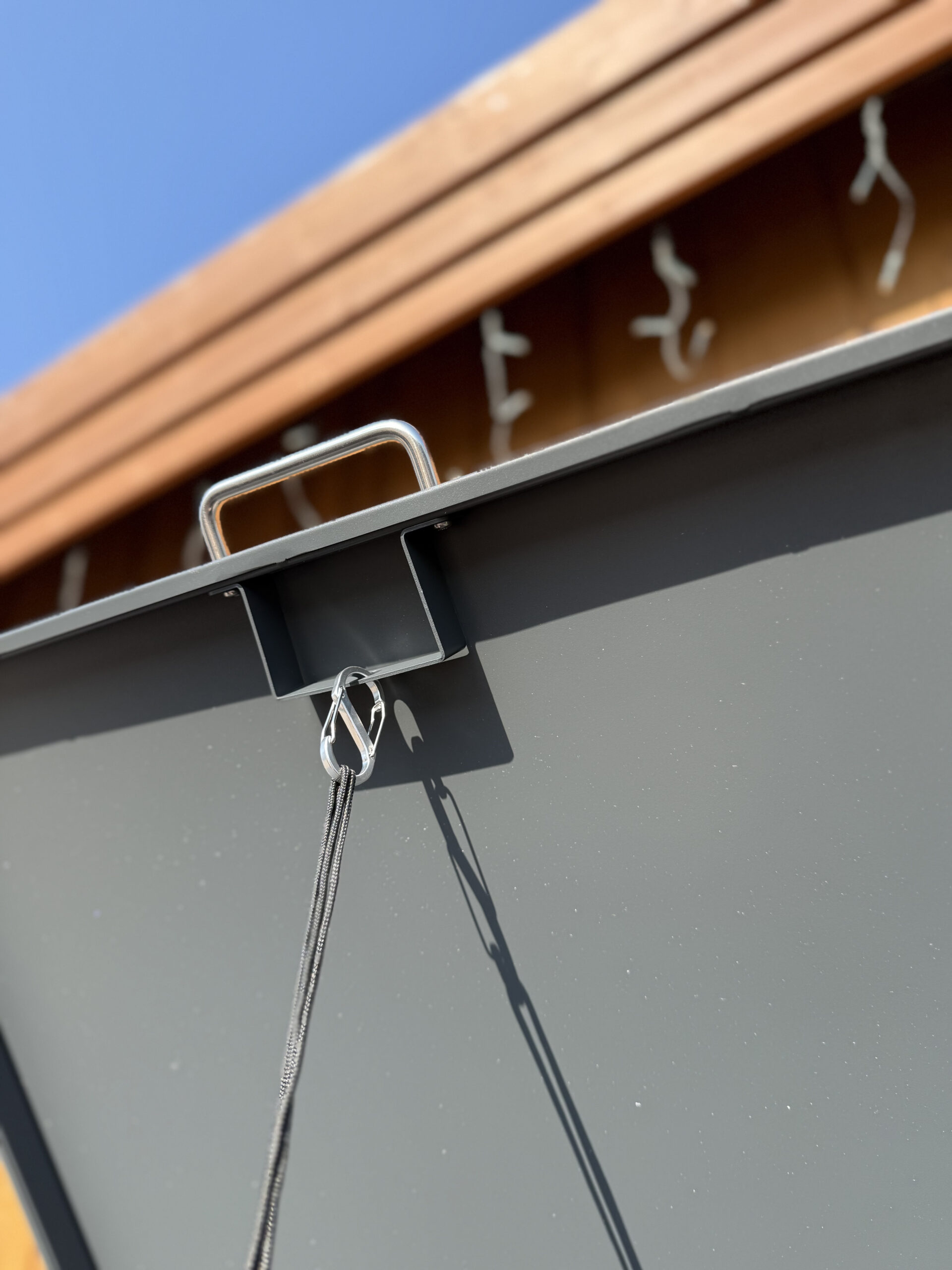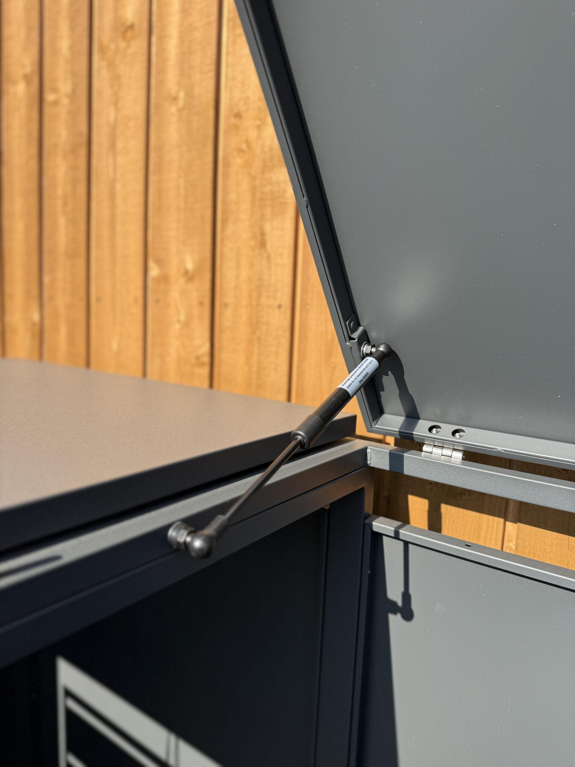 Stoginės paviršius dengtas milteline danga, kuri apsaugo nuo korozijos, UV spindulių ir mechaninių pažeidimų. Populiari antracito spalva puikiai paslepia nešvarumus ir dera su daugeliu kiemo ar pastato eksterjero sprendimų. Magnetiniai fiksatoriai – užtikrina, kad durys išliktų uždarytos net esant vėjui.