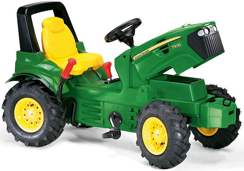Modelis atkartoja tikro traktoriaus dizainą – ryškiai žalias korpusas, geltoni ratlankiai ir realistiškos detalės. Atidaromas variklio gaubtas įtraukia vaikus į technikos pažinimą ir skatina smalsumą – mažieji smalsuoliai ten ras ir mažą daiktadėžę, kurioje patogiai telpa žaislai ar užkandžiai. Reguliuojama sėdynė užtikrina, kad traktorius „augtų“ kartu su vaiku. Dėka sustiprintos grandinės pavaros su reguliuojama grandinės įtampa, tvirtų ašių ir tyliai riedančių padangų, šis modelis garantuoja patikimumą ir ilgaamžiškumą. Tiek priekyje, tiek gale yra tvirtinimo kabliai, todėl galima jungti papildomus priedus ir priekabas – žaidimo galimybės išplečiamos dar labiau!