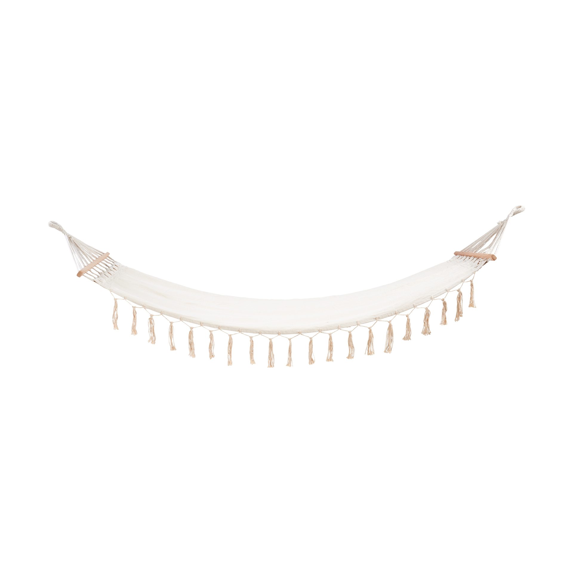 Šviesus, patogus pakabinamas hamakas Jūsų maloniam poilsiui. Hamakas, puoštas dailiais kutukais, pakabintas Jūsų terasoje, sode ar bet kur kitur – suteiks jaukumo. Medžiaginiai hamako galai pritvirtinti prie tvirtų medinių dalių. Hamakas pagamintas iš ilgaamžių medžiagų, tad tinkamai prižiūrimas Jus džiugins ne vienerius metus.