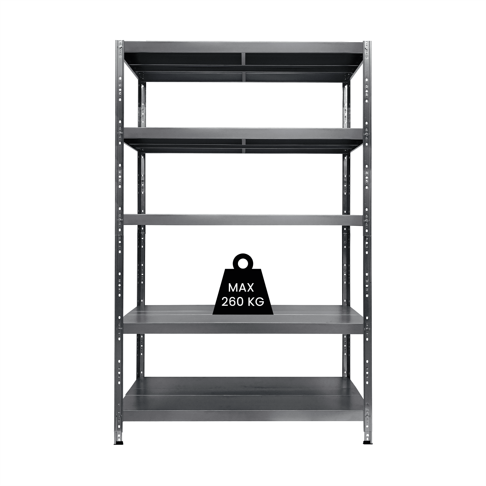 - Apkrova: Kiekviena iš penkių lentynų gali atlaikyti iki 260 kg, todėl ši lentyna yra ideali tiek sunkesniems, tiek lengvesniems daiktams laikyti. Tai puikus sprendimas tiek smulkesniems daiktams, tiek didesniems įrankiams ar kitoms sunkioms prekėms.