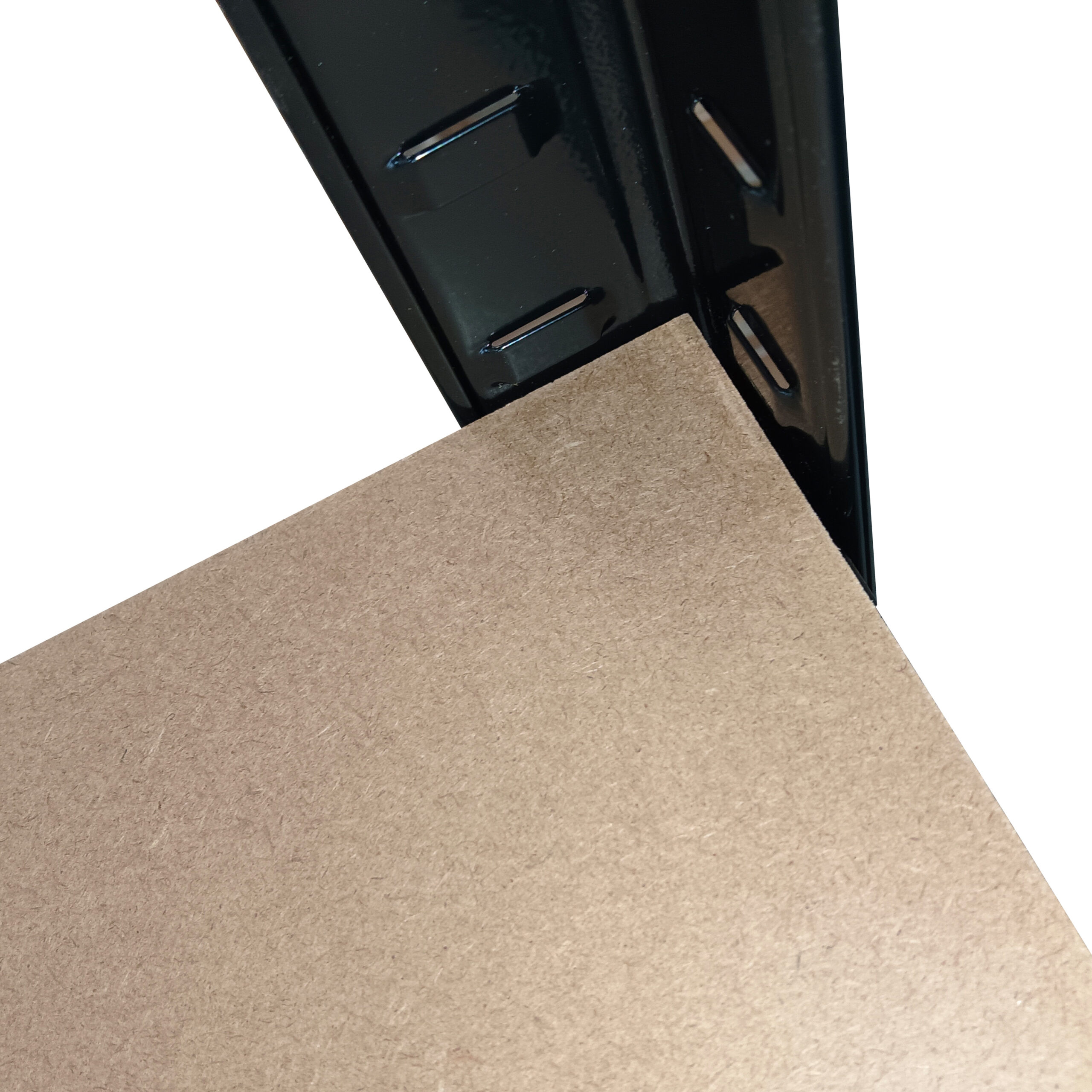 - Konstrukcija: milteliniu būdu dažytas 0.5 mm storio cinkuotas plienas (juoda spalva). 3.3 mm storio MDF plokštės lentynos.