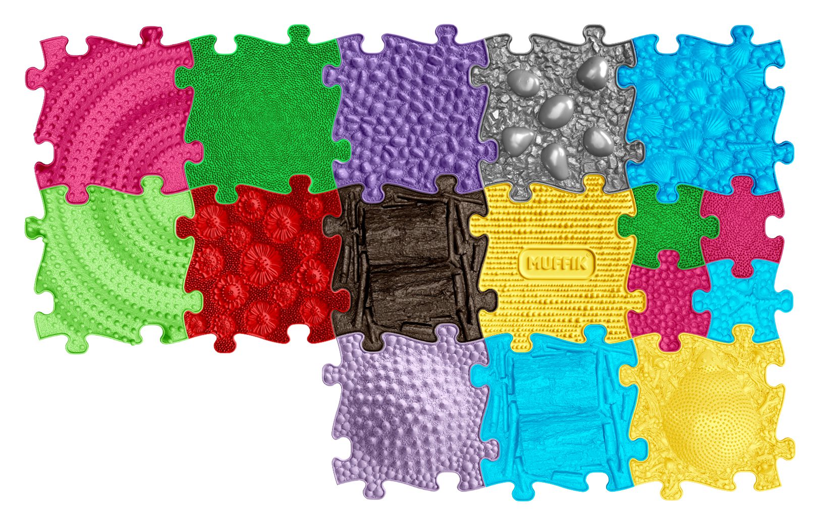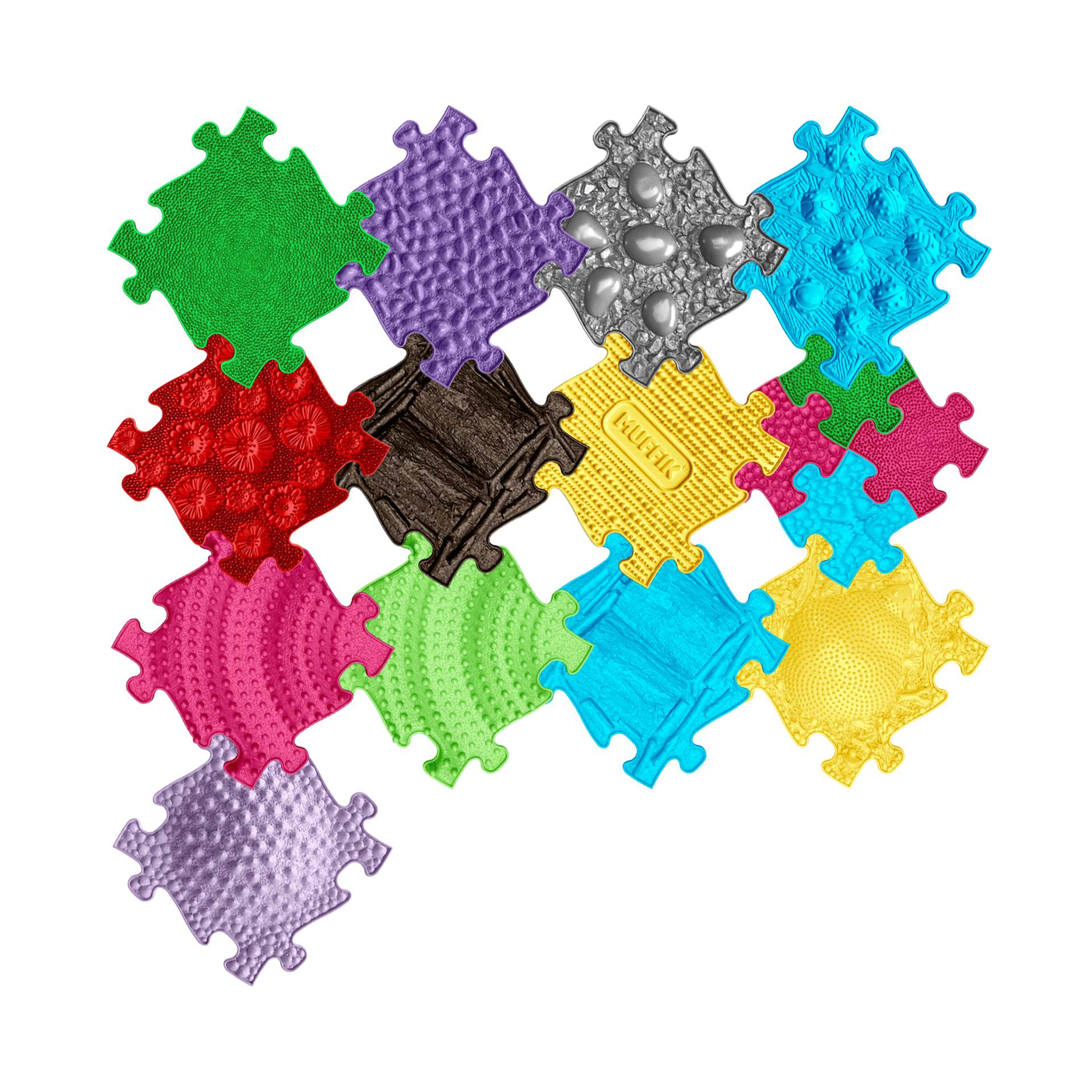 Rinkinį sudaro 16-lika skirtingų sensorinių ortopedinių dėlionės dalių.