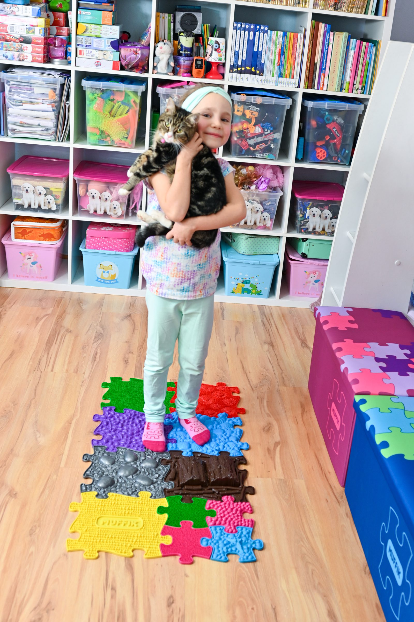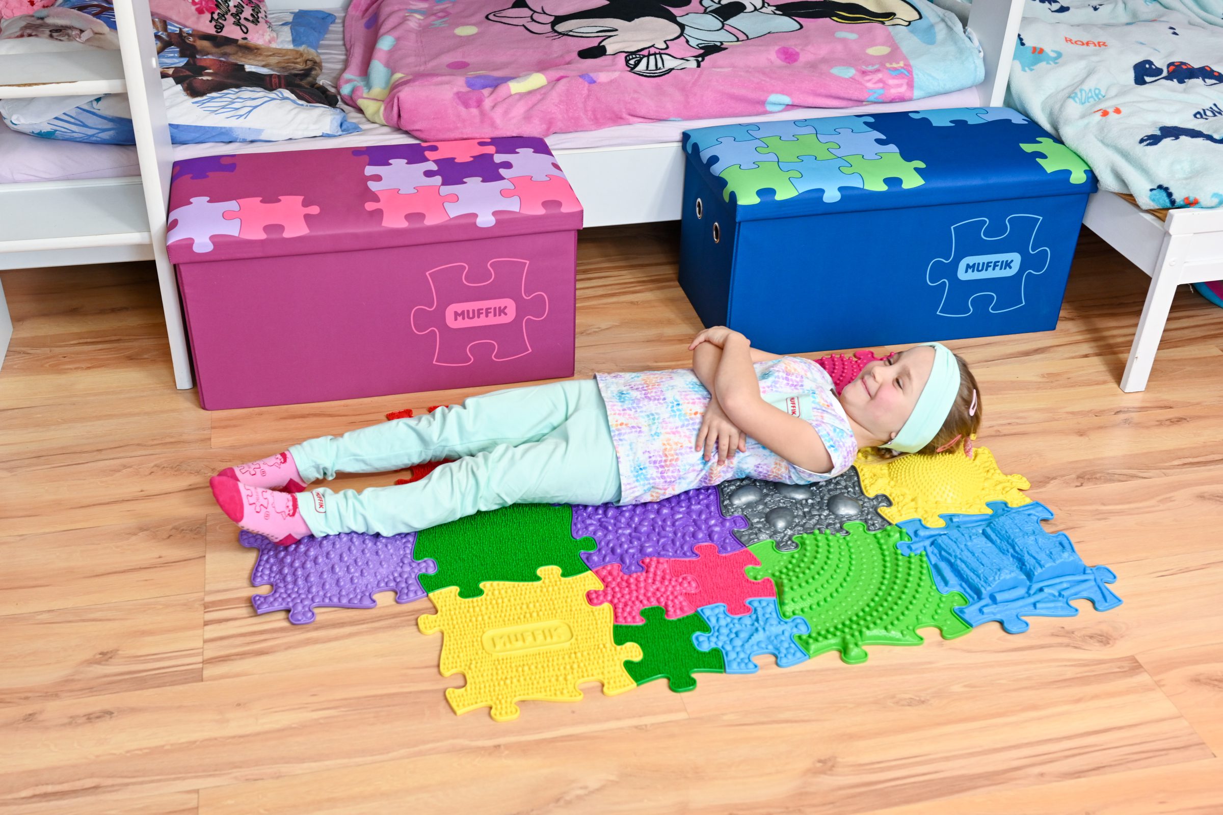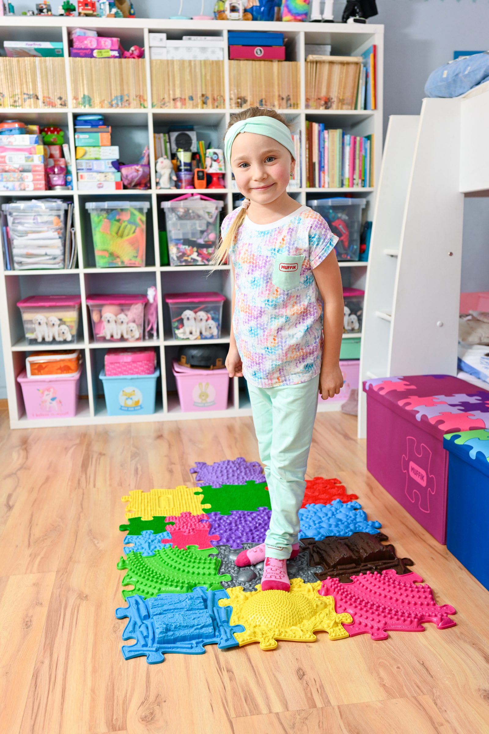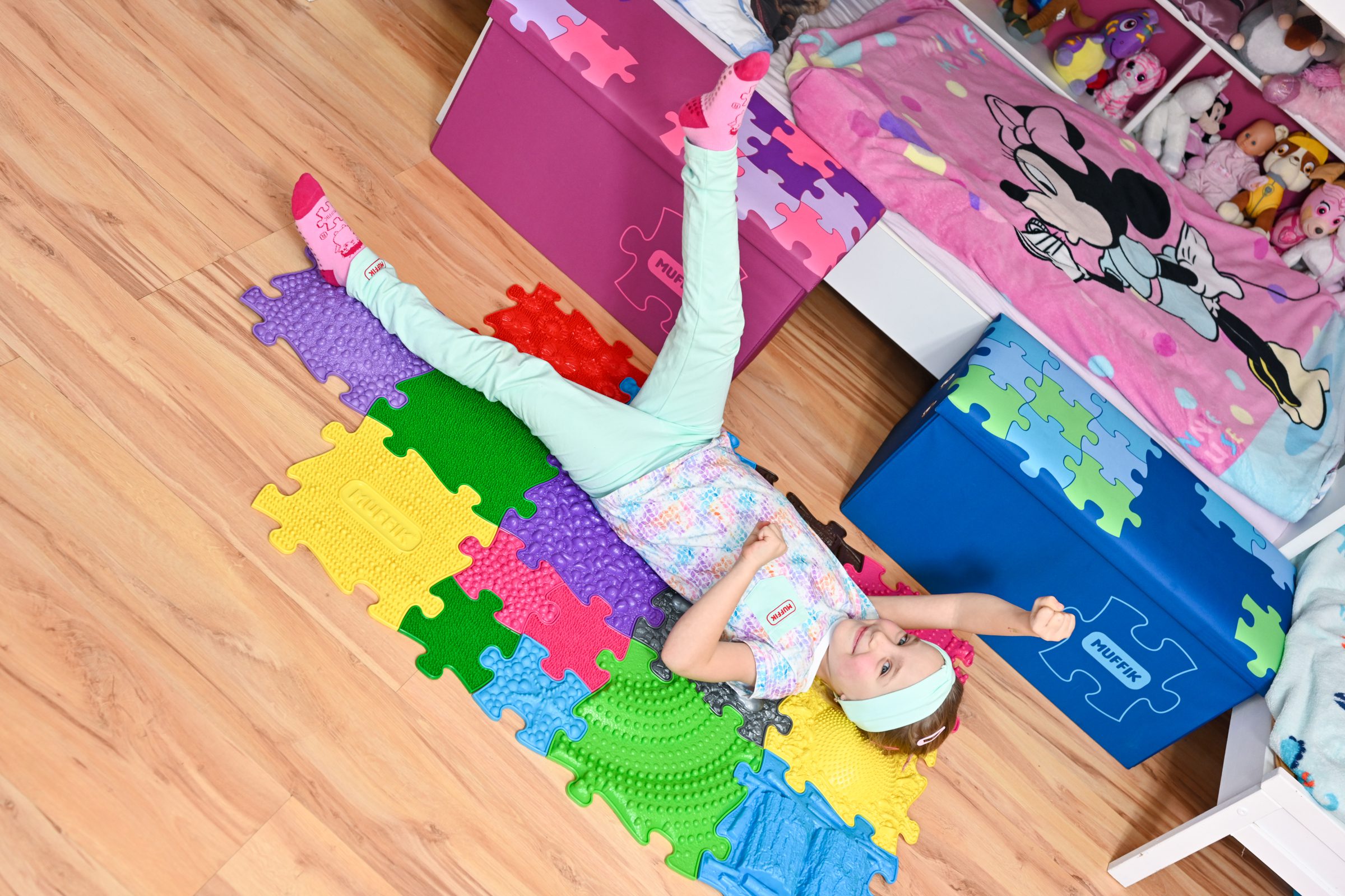Šis sensorinio ortopedinio kilimėlio dėlionės rinkinys parengtas bendradarbiaujant kartu su fizioterapeutais.