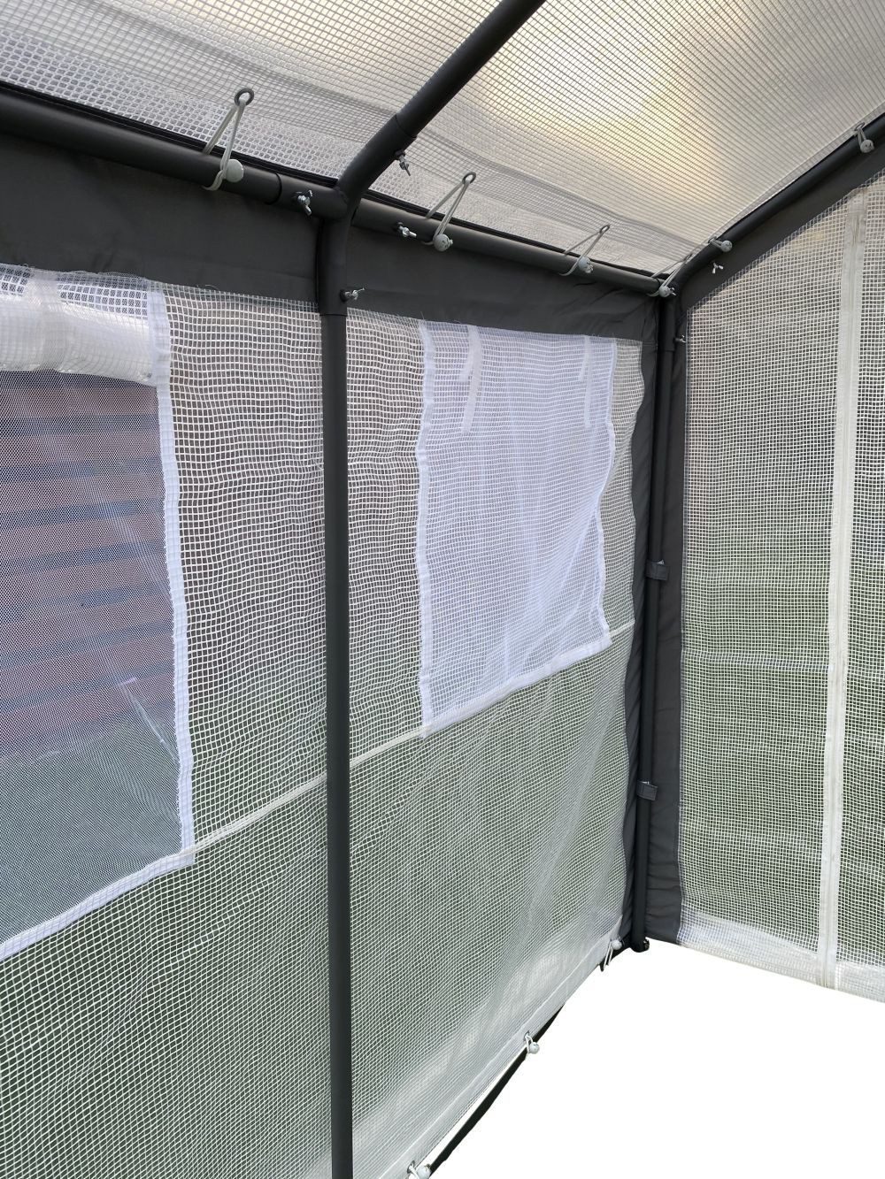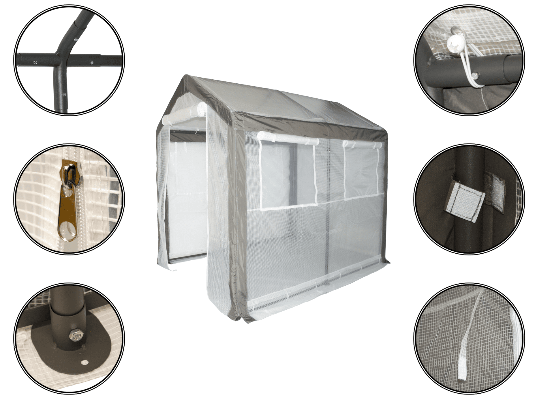 Šiame šiltnamyje yra įrengti keturi langeliai, kurie užtikrins, kad Jūsų auginamos gėrybės gautų pakankamai saulės spindulių. Langeliai turi tinklelį nuo uodų ir nuleidžiamas užuolaidas, kurių pagalba galite reguliuoti šiltnamyje esančią temperatūrą. Šiltnamio duris galima susukti į ritinį norint laikyti jas atviras, uždaryti šiltnamį galima užtrauktukų pagalba. Cinkuoto plieno rėmas užtikrina šiltnamio konstrukcijos stabilumą. Šiltnamio konstrukcija itin lengva bei mobili, todėl nesudėtingai galėsite jį perkelti į Jūsų norimą vietą.