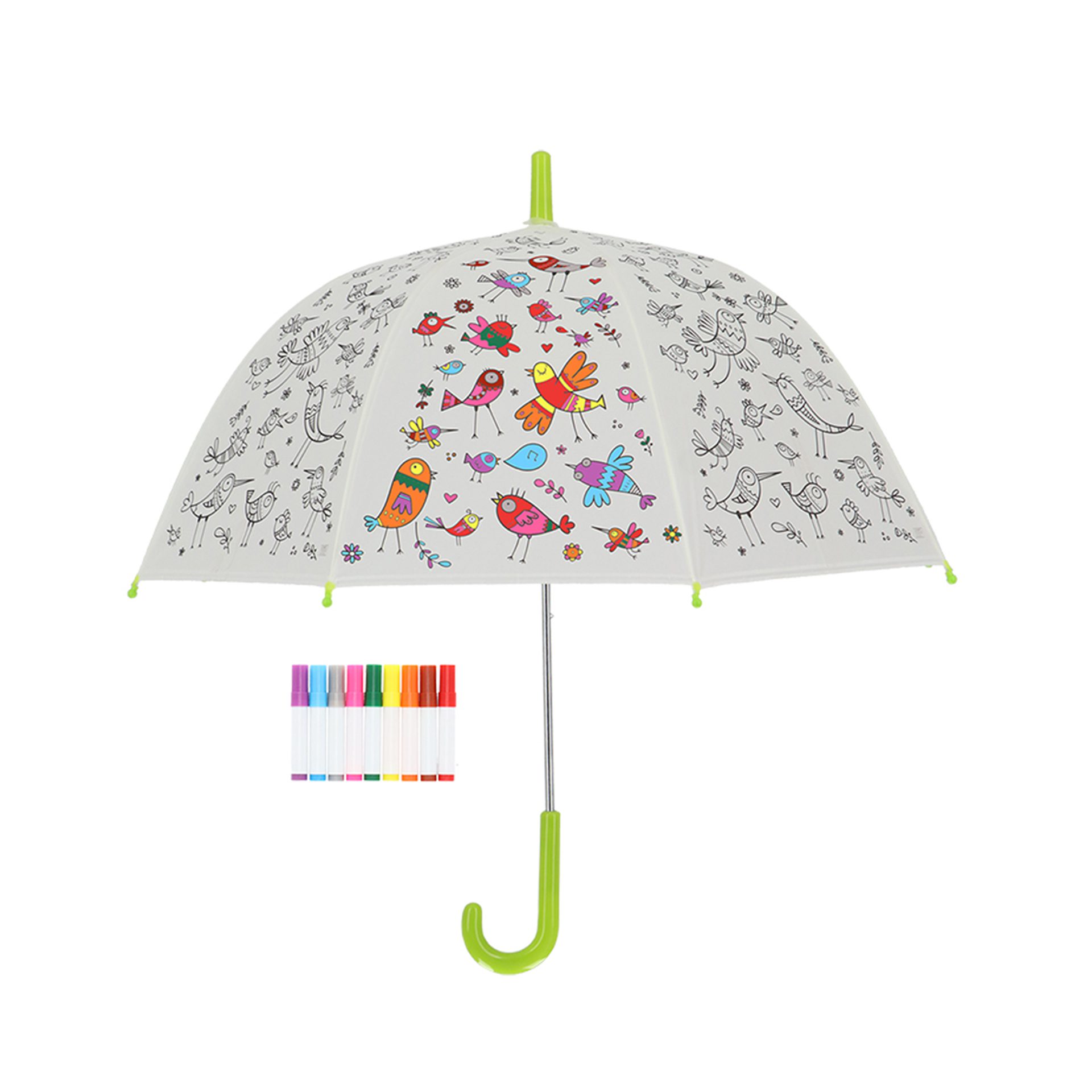 Nėra blogo oro – reikalingi tik tinkami aksesuarai! Skėtis gali tapti ypatingu, kai jį nuspalvini pats. Dailios formos skėtis, išpieštas linksmais paukšteliais, kuriuos galima nuspalvinti ir pasivaikščiojimą lietuje paversti spalvingai smagiu. Leiskite mažųjų kūrybiškumui lietis per kraštus spalvojant šį skėtį. Prie skėčio pridedami įvairių spalvų markeriai. Skėtis skirtas vaikams (bet tinkamas ir suaugusiems).