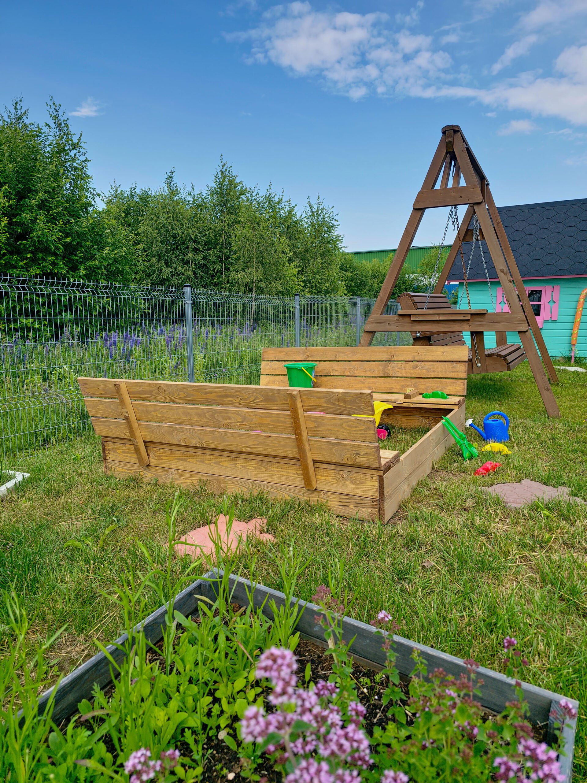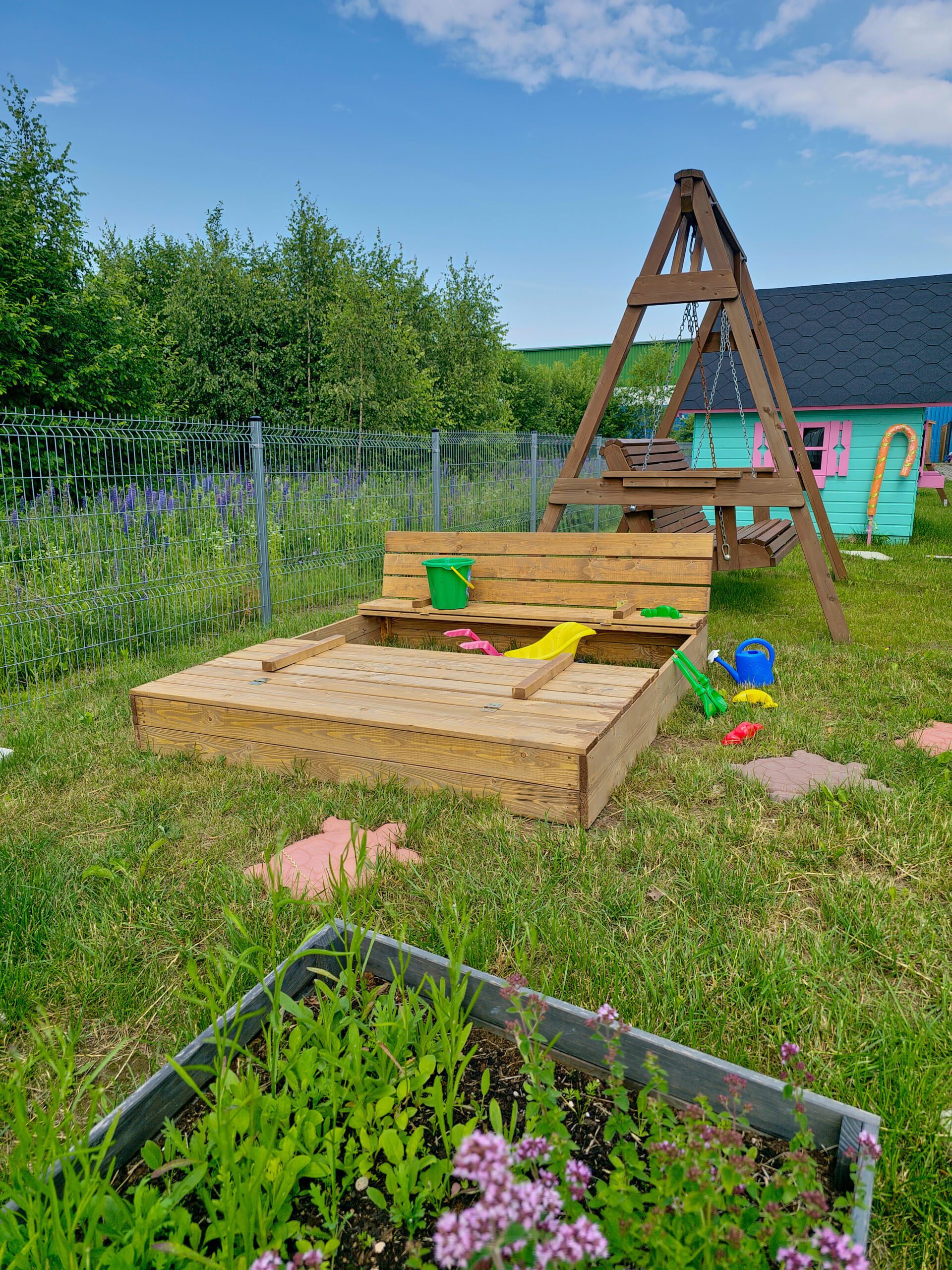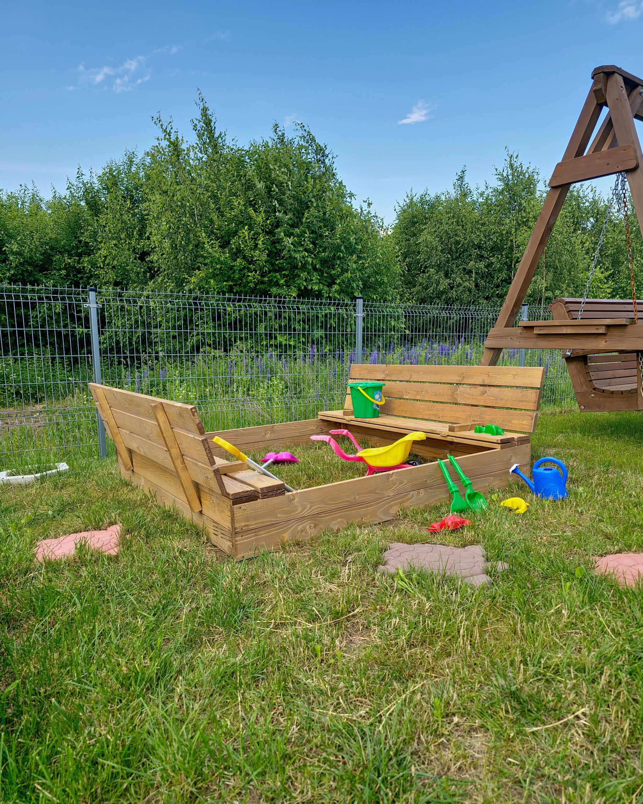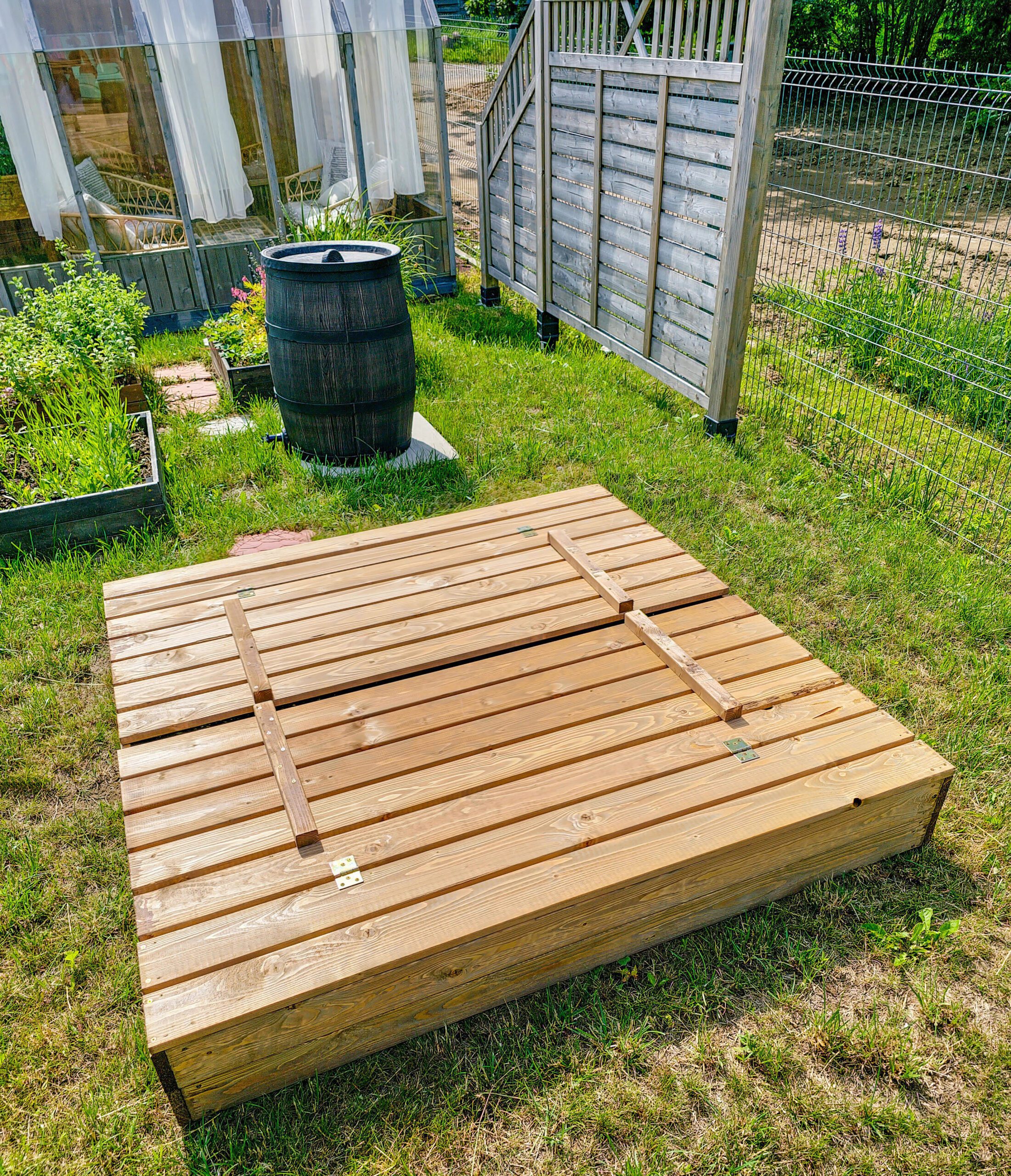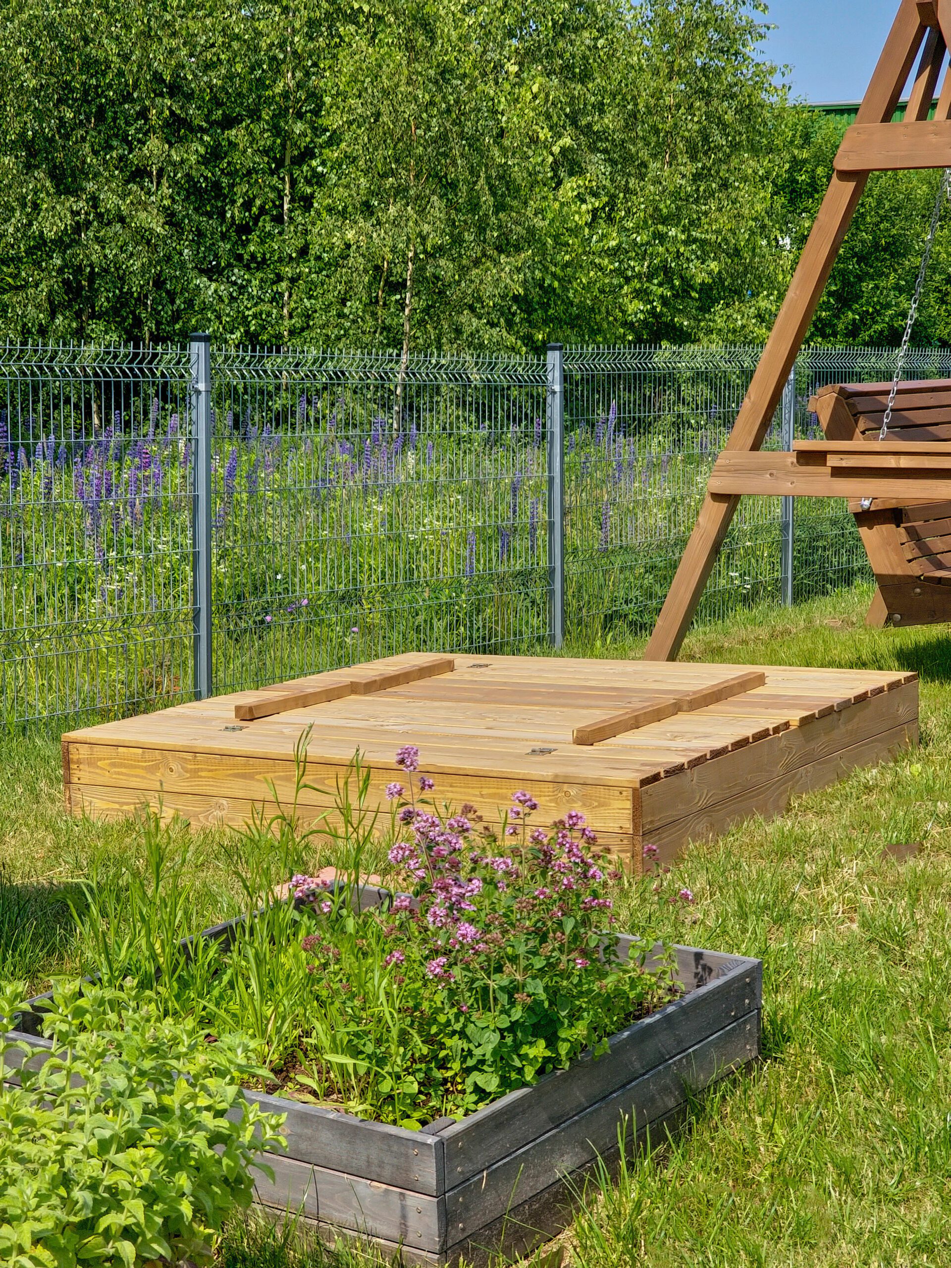 Praktiška ir funkcionali smėlio dėžė, pagaminta iš džiovintos spygliuočių medienos, komplektuojama su dangčiu, kuris apsaugo smėlį nuo neigiamų aplinkos veiksnių ar gyvūnų teršimo ir transformuojasi į suoliukus šonuose.
