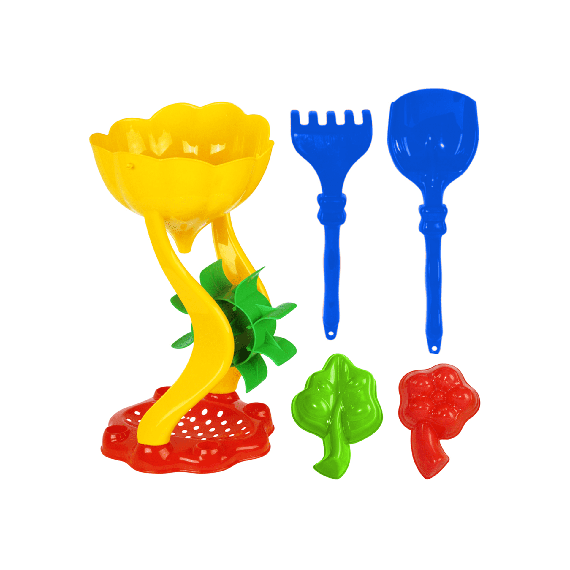 Smėlio žaislų rinkinyje yra viskas ko reikia smagiam laikui smėliadėžėje ar paplūdimyje – vandens malūnėlis su sieteliu, nedidelis grėbliukas, kastuvėlis ir dvi augalų formelės. Šis gaminys pagamintas iš patvarių ir saugių žaliavų, kurių neveikia neigiamos oro sąlygos ir yra saugios kūdikiams.