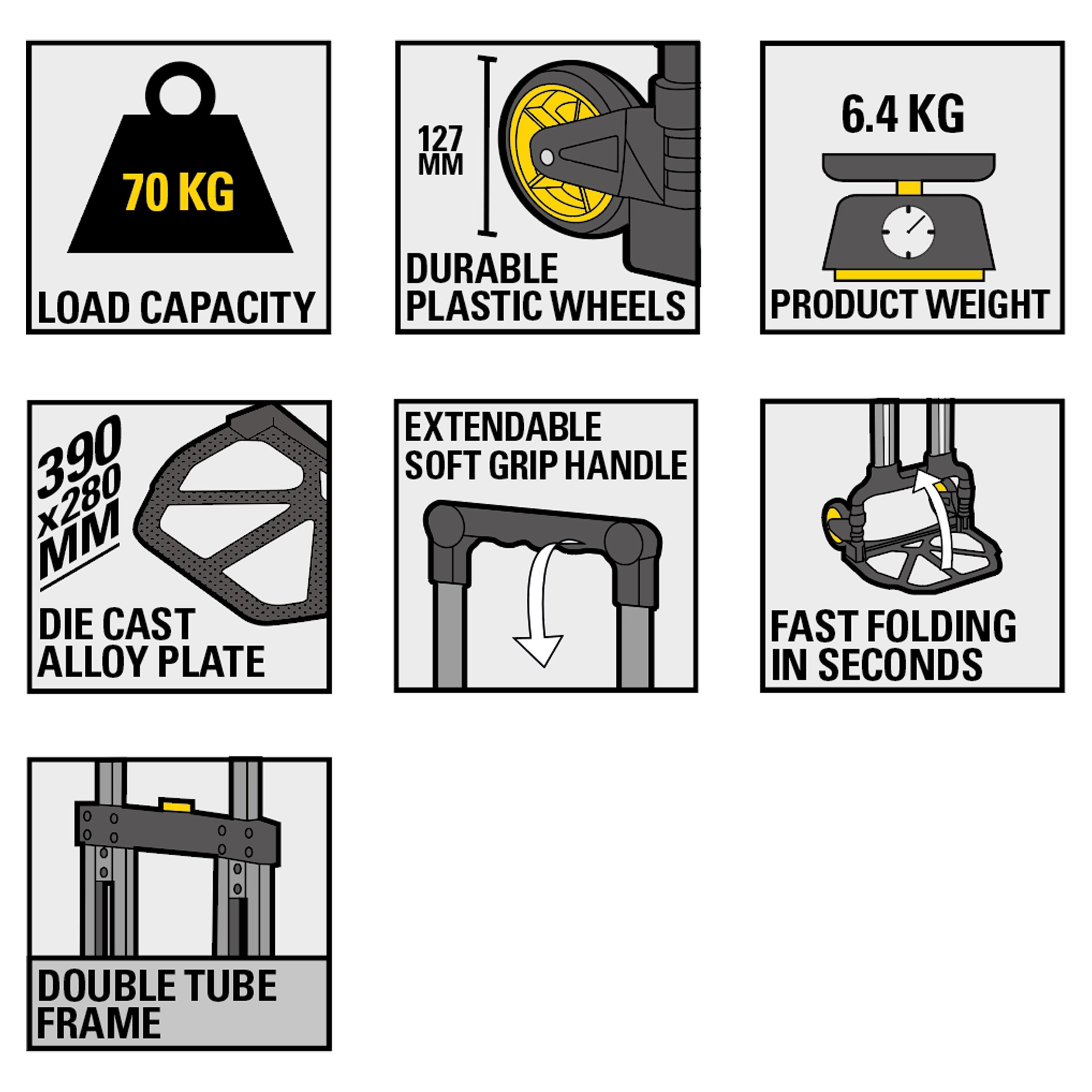 Patentuotas aukštos kokybės krovininis vežimėlis su praktiška konstrukcija, skirtas patogiam ir saugiam prekių gabenimui. Greitai ir lengvai sulankstomas bei išskleidžiamas – paruošiamas naudoti vos per kelias sekundes. Pagrindiniai plastikiniai apkrovos taškai pagaminti iš ypač tvirto nailono, kitos plastikinės dalys – iš polipropileno, užtikrinant vežimėlio ilgaamžiškumą ir saugų naudojimą. Konstrukcija pagaminta iš aliuminio ir nerūdijančio plieno, suteikiant optimalią tvirtumą ir funkcionalumą tiek buityje, tiek profesionalioje aplinkoje.