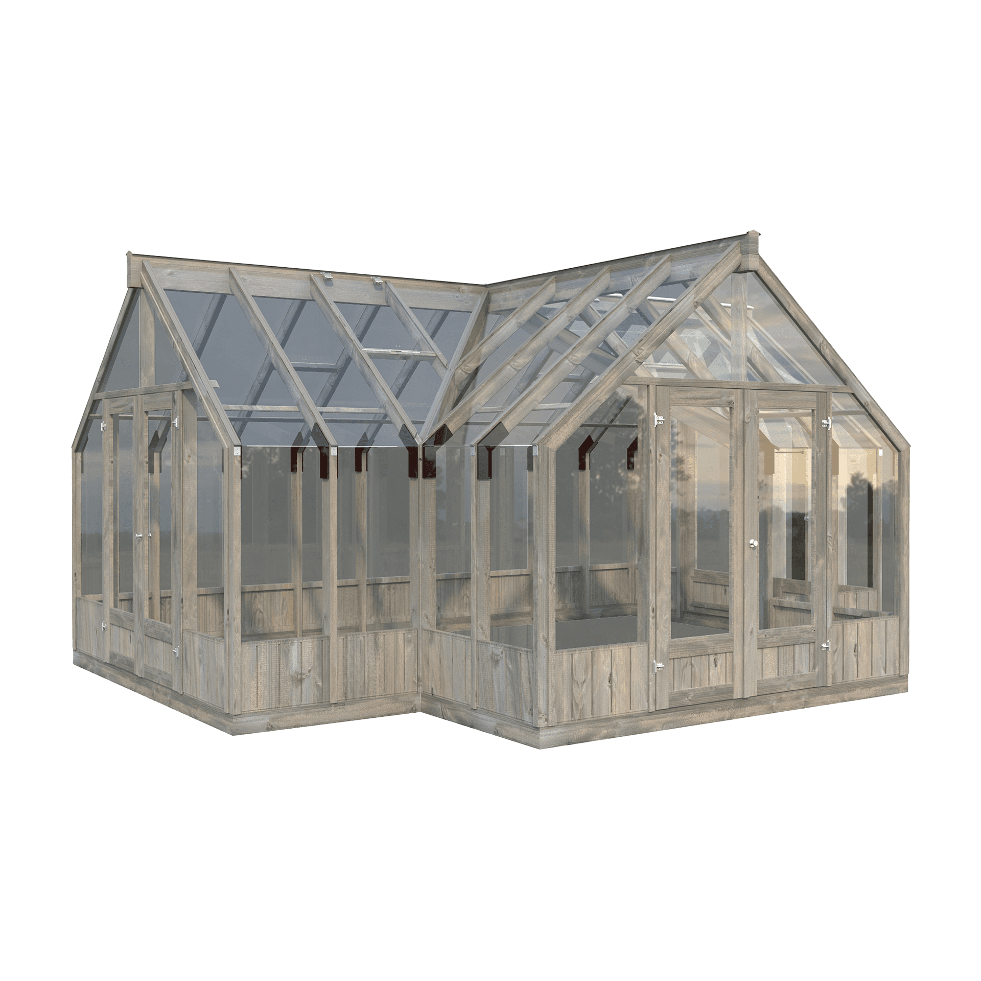 LANGAI IR DURYS. Jūsų patogumui stogo dalyje yra automatiškai atsidarantys grūdinto 4mm stiklo stoglangiai 4 vnt, po 2 vnt kiekvienoje stogo pusėje, su įmontuota Thermovent technologija. Sušilus temperatūrai iki 17-25ºC, skystis, esantis cilindre sušyla ir plėsdamasis išstumia stūmoklį. Temperatūrai sumažėjus, stoglangis automatiškai užsidaro. Maksimalus stoglangio atsidarymo aukštis – 45 cm. Maksimalus atsidarymo spindulys pasiekias temperatūrai sušilus iki 30ºC. Durys įstiklintos viengubu grūdintu 4mm stiklu bei rakinamos cilindrine spyna. Plačiai atidaromi durys 138 x 182 cm. Trys įėjimai į stiklinį namelį Jūsų patogumui, bei oro reguliavimui bei vėdinimui.