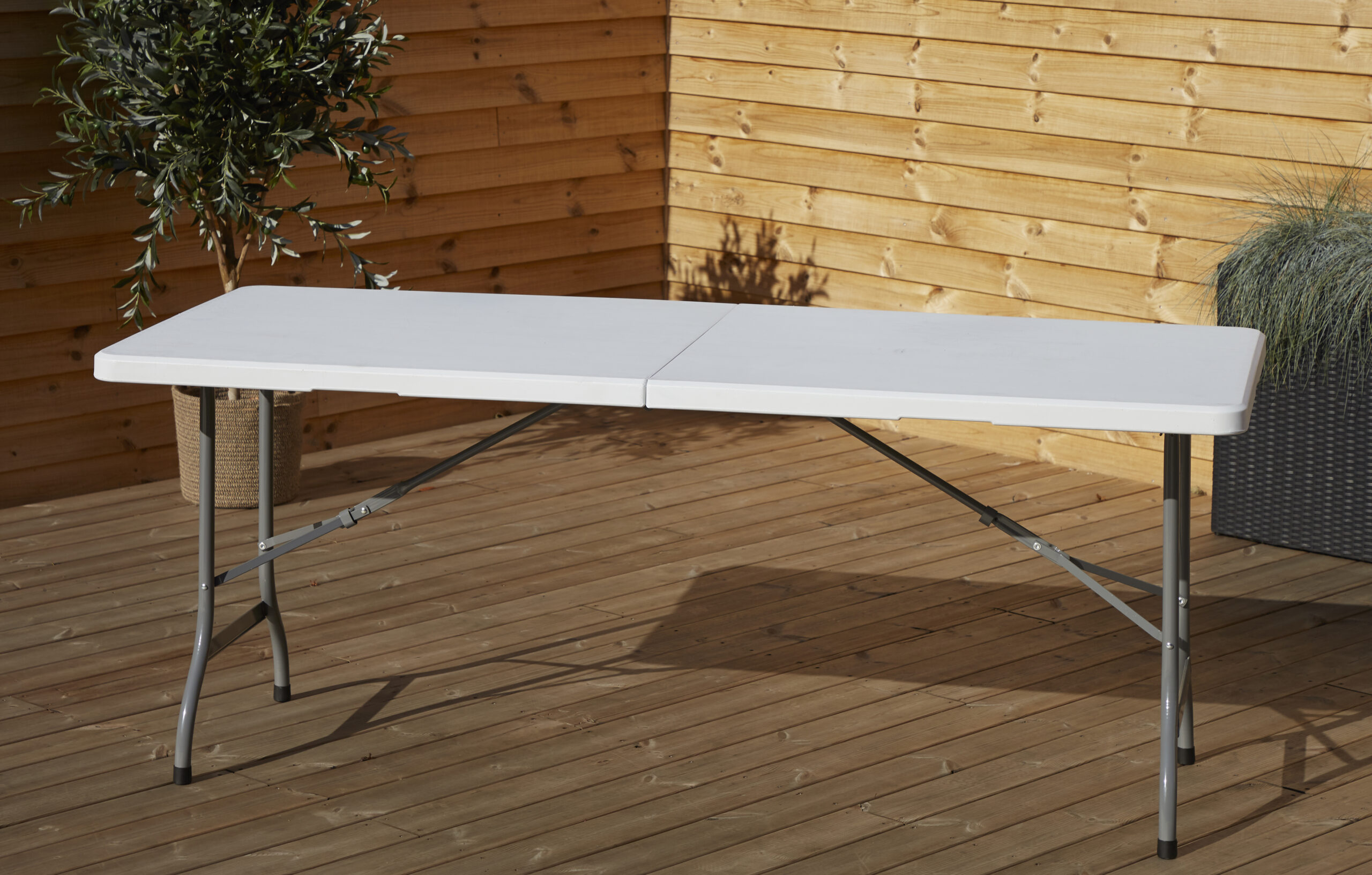 Tvirtos metalinės stalo kojos ir patvaraus plastiko stalviršis užtikrina stabilumą bei ilgaamžiškumą. Sulanksčius stalą, jis užima itin mažai vietos, todėl jį lengva sandėliuoti, kai jis nėra naudojamas. Rankenų pagalbą sulankstytą stalą galima nesudėtingai transportuoti iš vienos vietos į kitą.