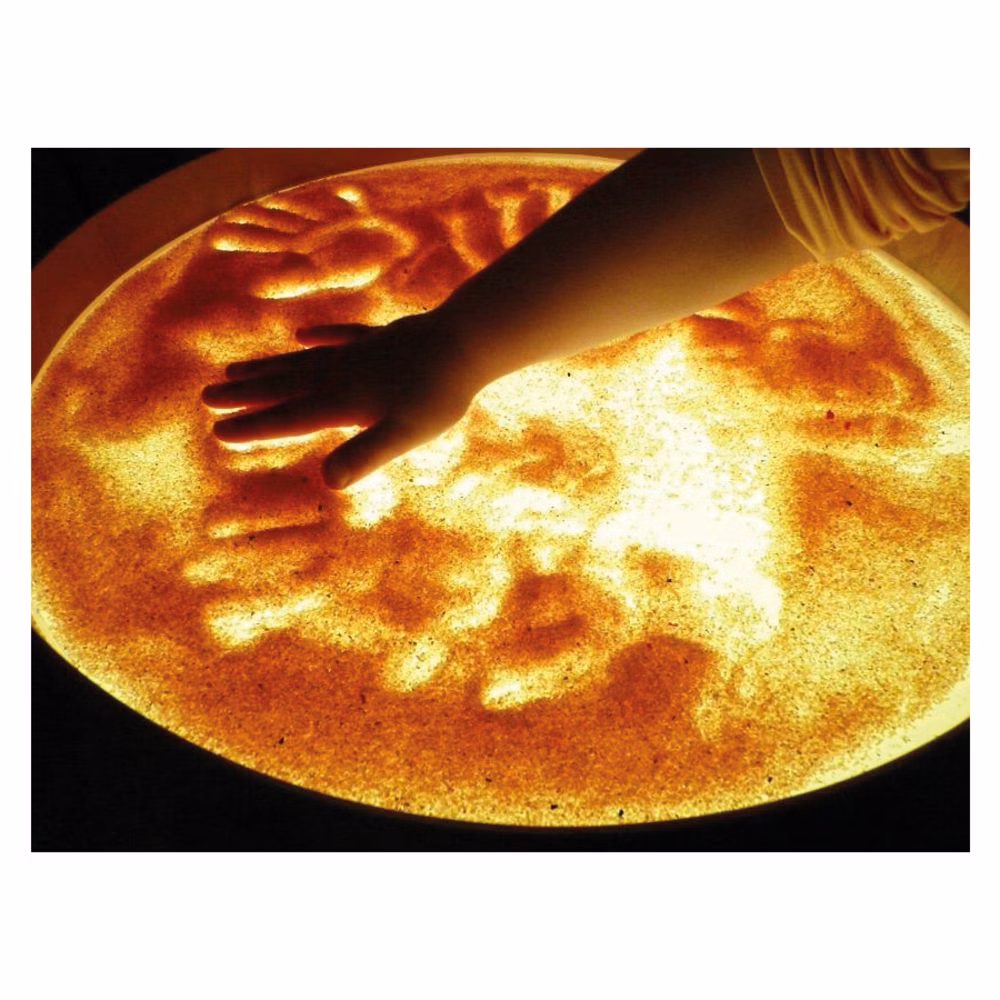Šis ypatingas apvalus žaidimų ir kūrybos paviršius, kuris šviečia ir keičia spalvas — puikiai tinka smėlio piešimui, akrilininėms kaladėlėms, tyrinėjimui ir sensorinių veiklų erdvėms. Vaikai gali ant šviesos stalo plokštumos dėlioti smėlį, žymėtis linijas, piešti pirštais, teptuku. Naudoti išskirtinį LED apšvietimą — galima reguliuoti ryškumą, spalvas ir automatinius spalvų perėjimus pateiktu nuotolinio valdymo pultu. Kurti pasakojimus, tyrinėti formas ir spalvas, tyrinėti skaidrius elementus arba papildomas medžiagas.