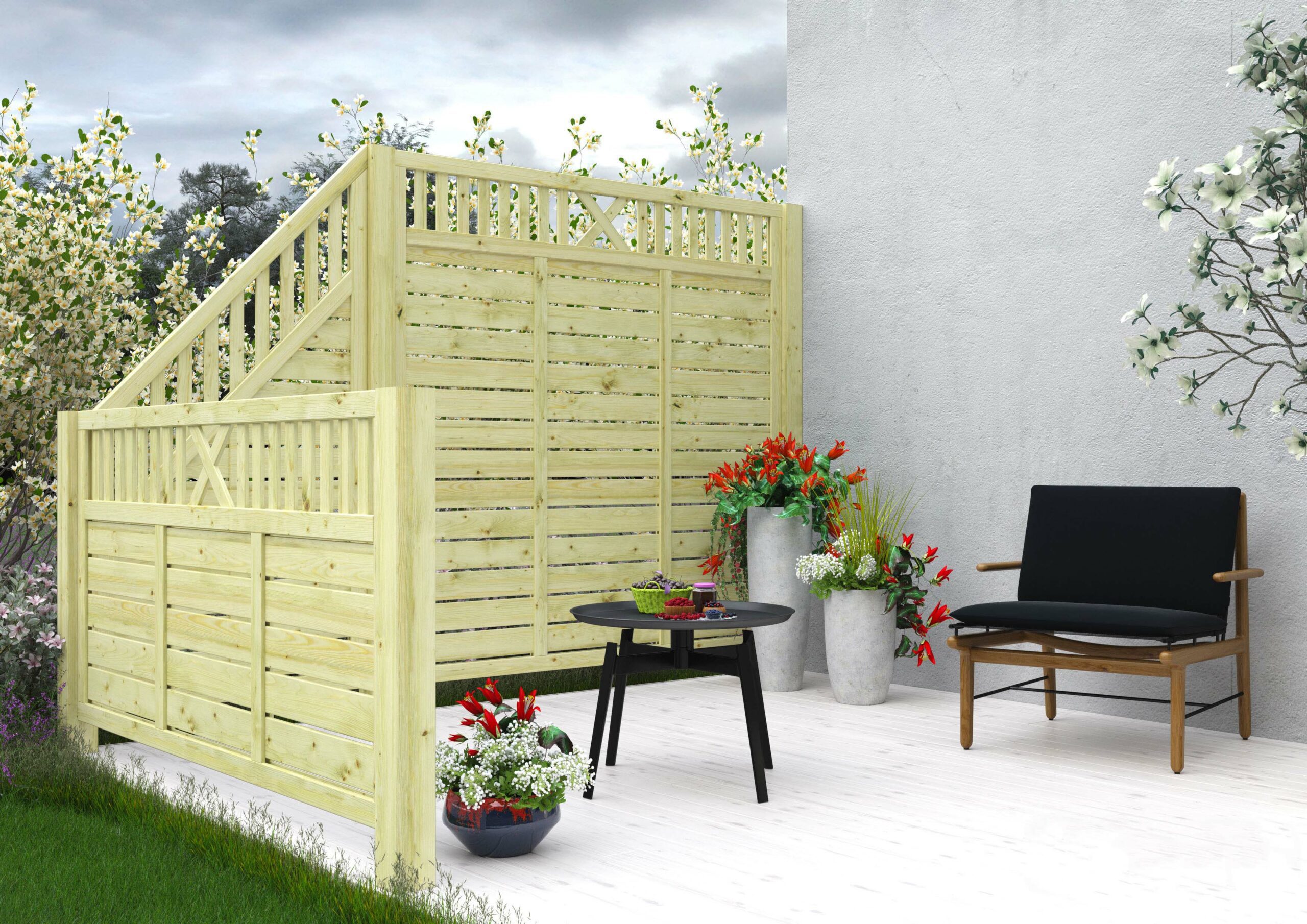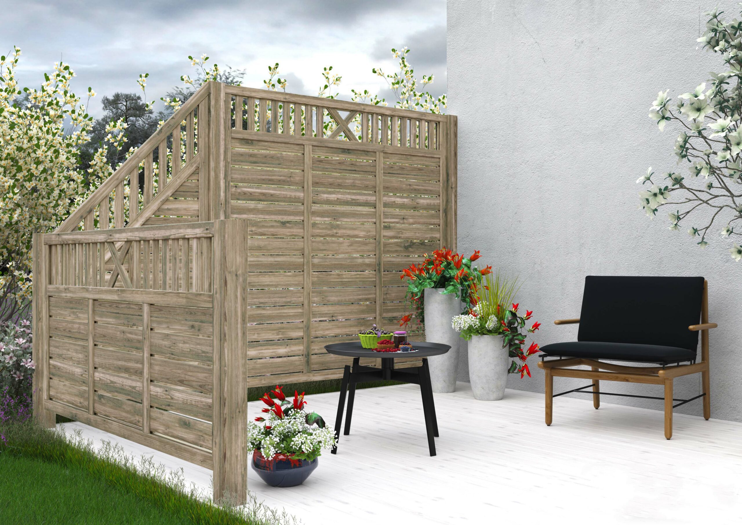 Medinė modulinė tvora – šiuolaikiškas, estetiškas ir paprastas lauko erdvės projektavimo sprendimas. Pasitelkiant patogų segmentinių tvorų jungimo būdą, paprastai ir greitai sukursite unikalią tvorą savo aplinkai. Pasirinkę Jums patinkančio rašto, spalvos bei formos tvorų segmentus, susikursite tvorą pagal savo poreikius. Jūsų terasa su stilinga medine tvora atrodys estetiškai, suteiks jaukumo ir privatumo jausmą bei suteiks užuovėją.
