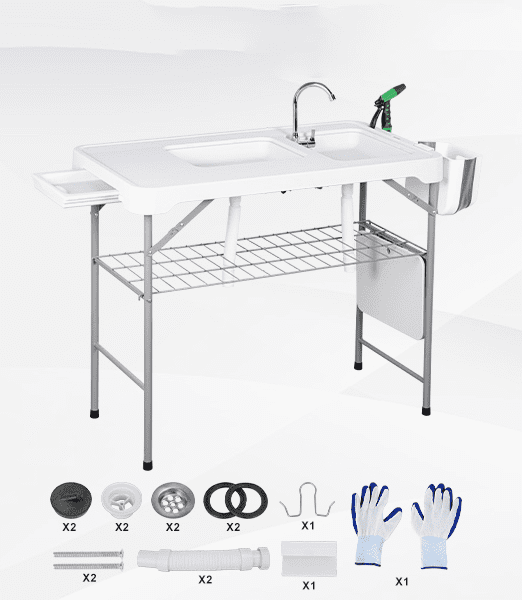 – Komplektacija: sulankstomas čiaupas, vandens purkštuvas, nutekėjimo sistema, šiukšliadėžė, įrankių rinkinys (pirštinės, peilis, galąstuvas, žvynų skustukas, pincetas).