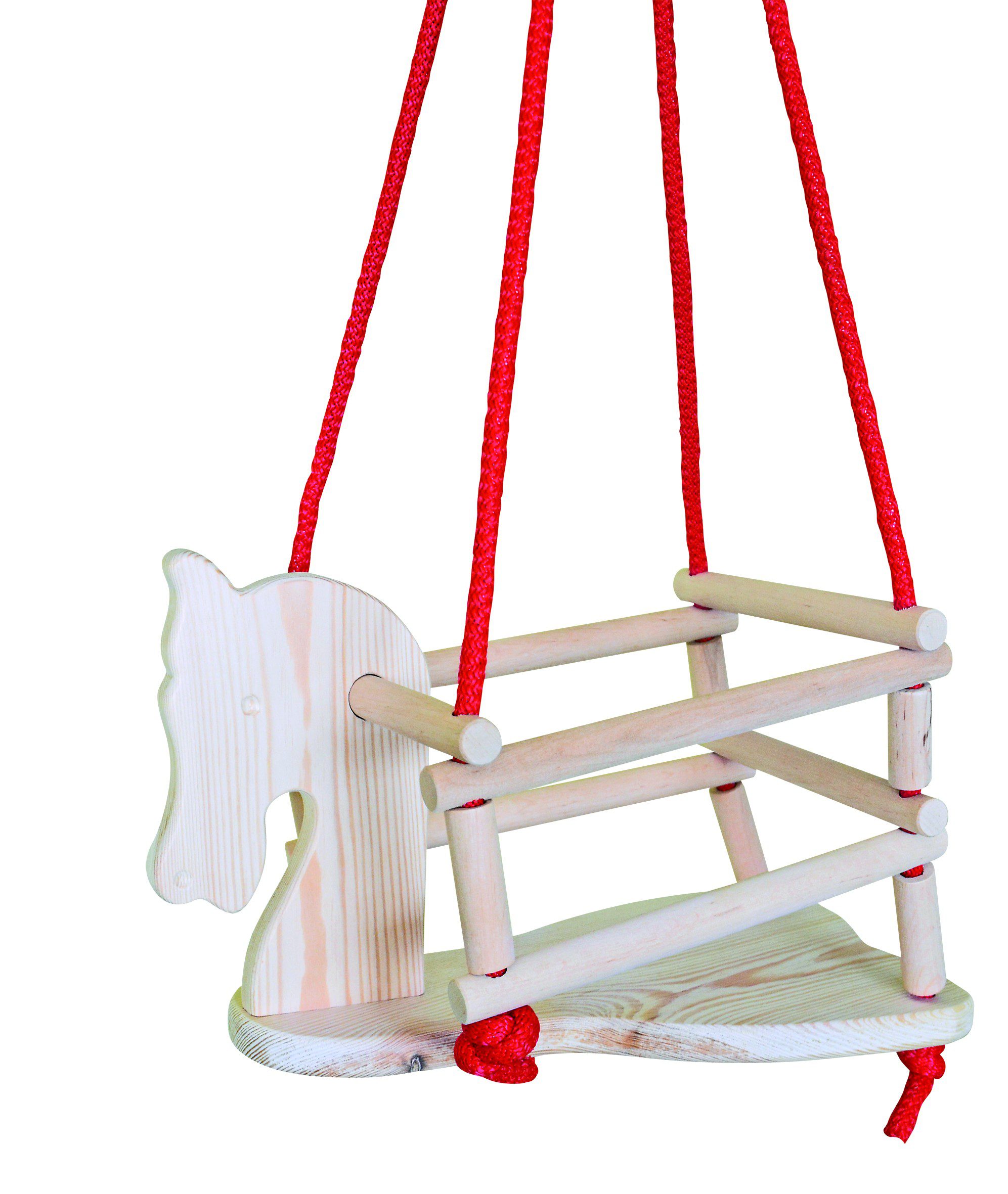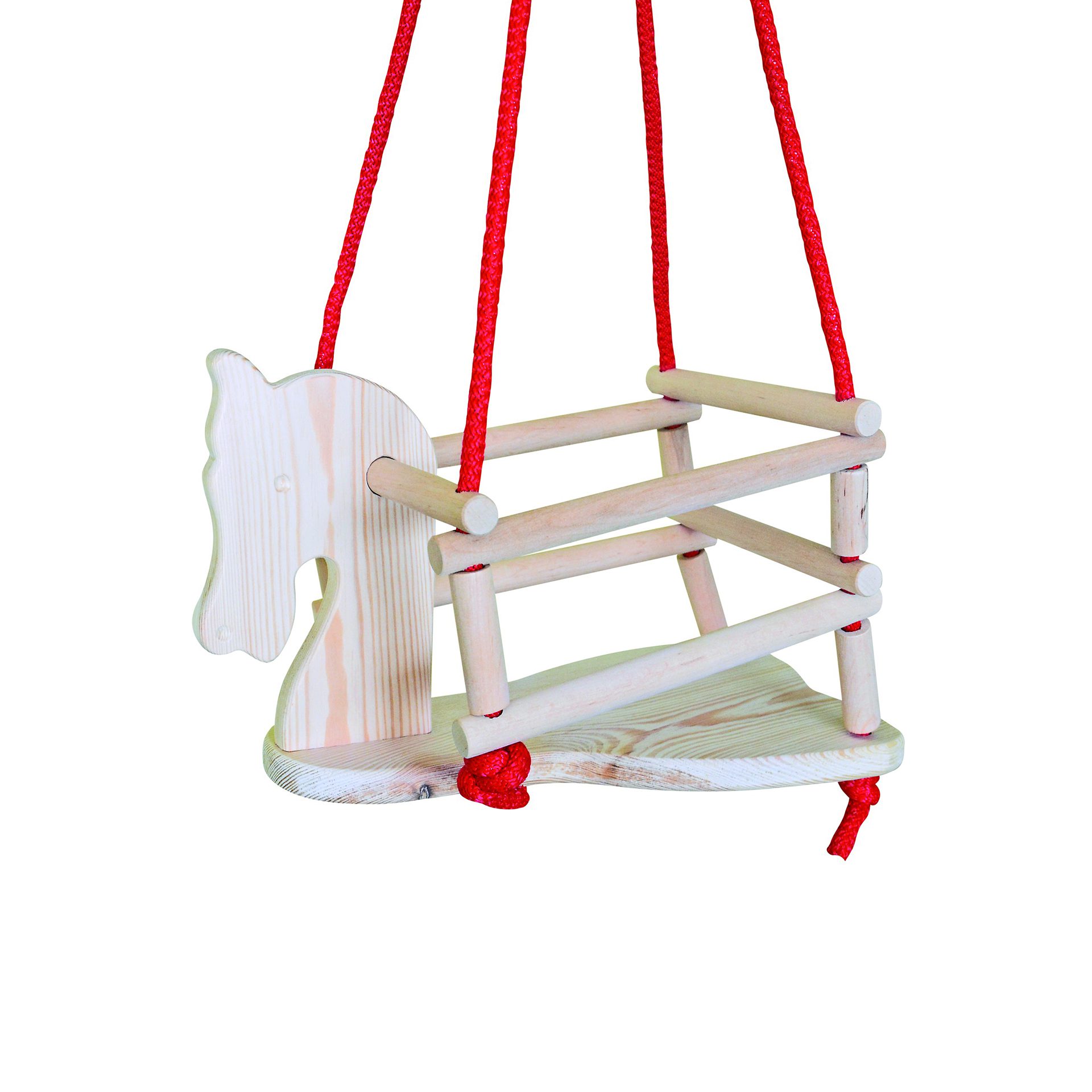 Medinės sūpynės su arkliuko motyvu, kuris linksmybes pavers dar patrauklesnėmis. Dėl užapvalintų saugos diržų vaikas yra apsaugotas nuo iškritimo iš sėdynės ir įbrėžimų. Sūpynės aprūpintos storomis, tvirtomis virvėmis.