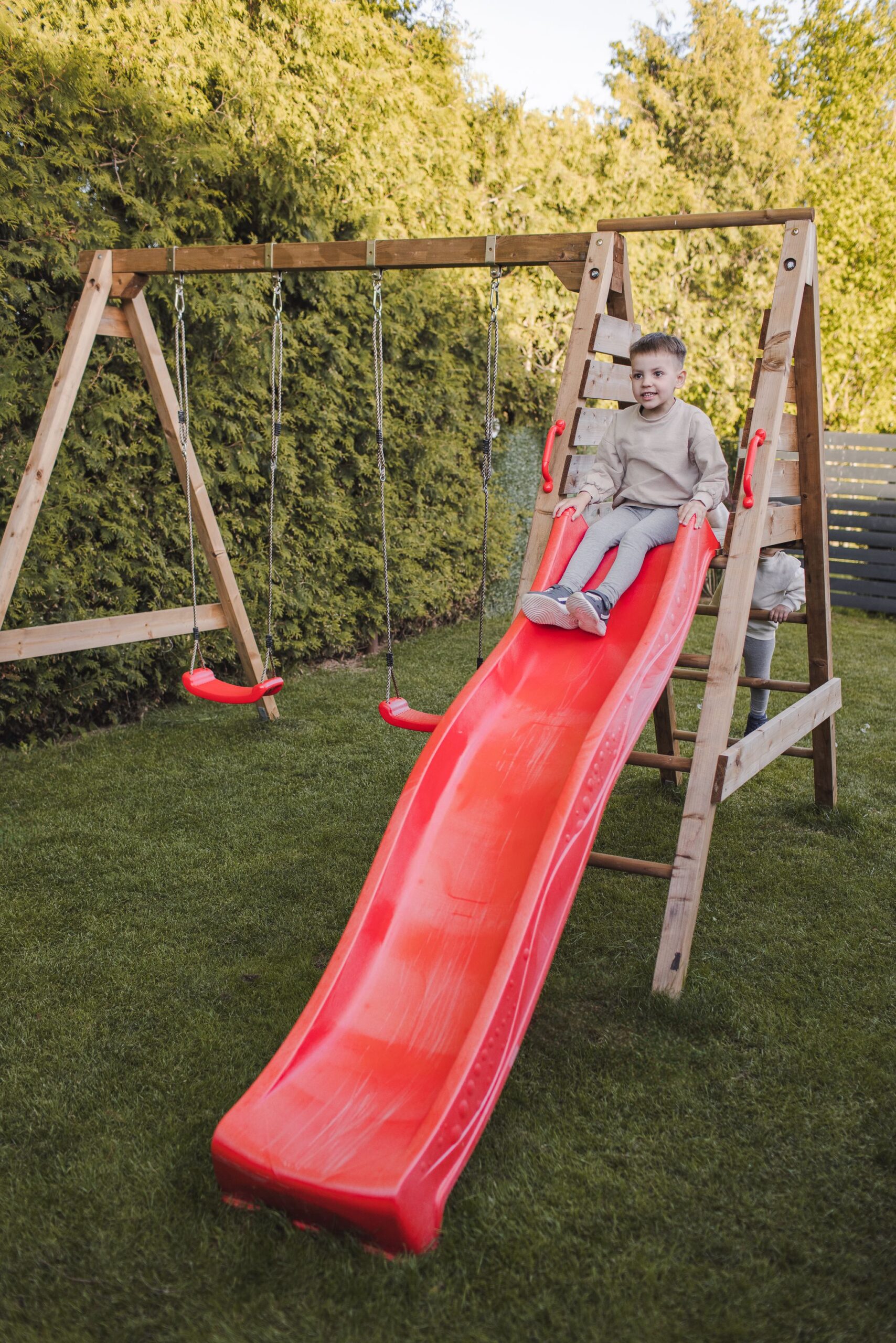 Vaikų žaidimų aikštelė EGLĖ – aktyvioms ir nepamirštamoms Jūsų vaikų laisvalaikio akimirkoms gryname ore. Aktyvus laisvalaikis gryname ore bus naudingas, malonus ir kupinas šypsenų. Komplektacijoje nėra čiuožyklos, rekomenduojame papildomai įsigyti 220 cm ilgio čiuožyklą.