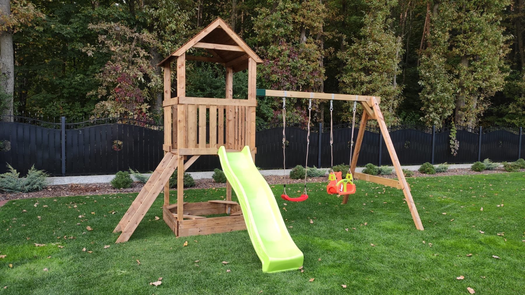 PASTABA! Žaidimų aikštelės pristatomos nesurinktos ir nenudažytos. Supynių spalva gali skirtis nuo matomų nuotraukoje.