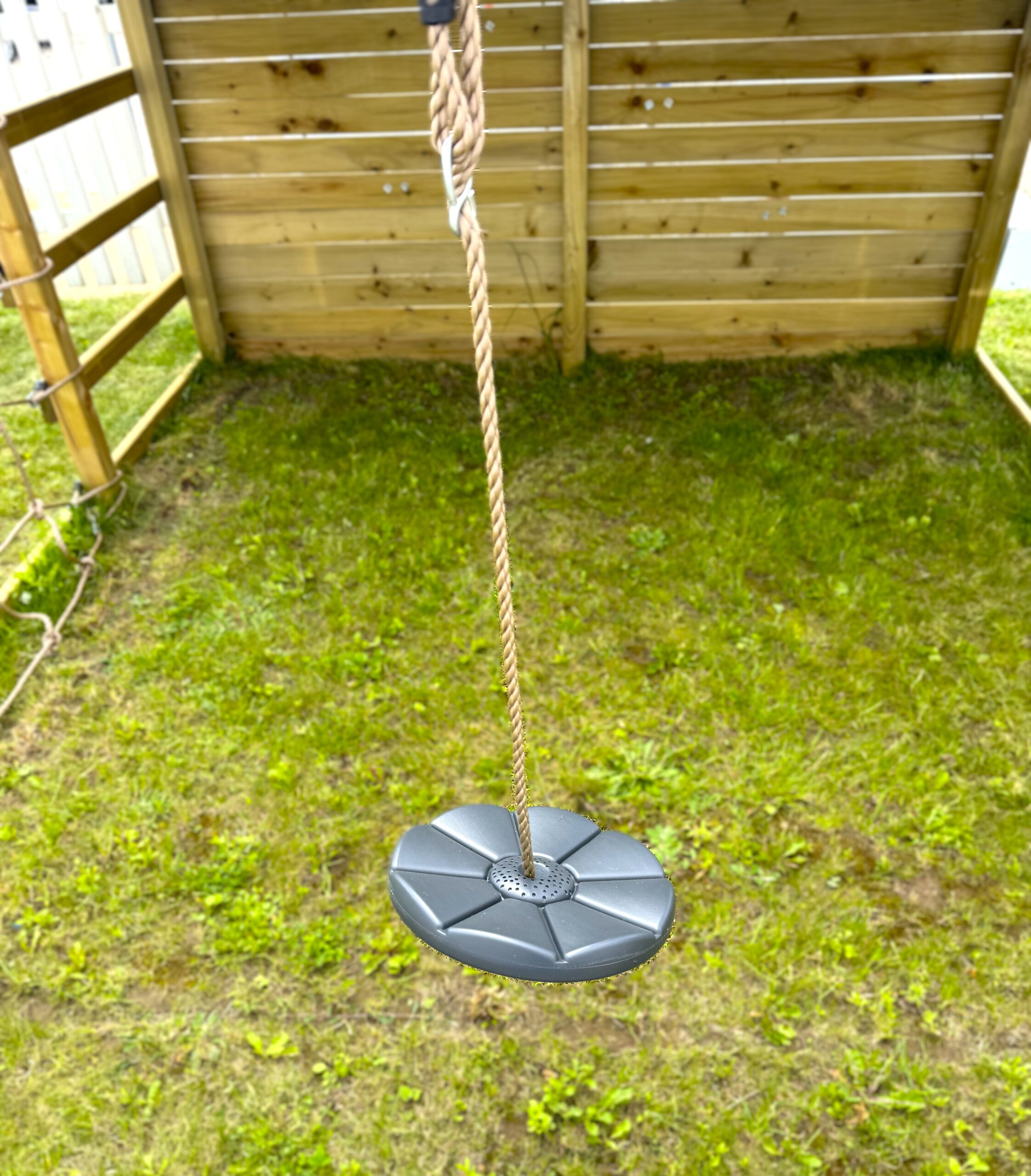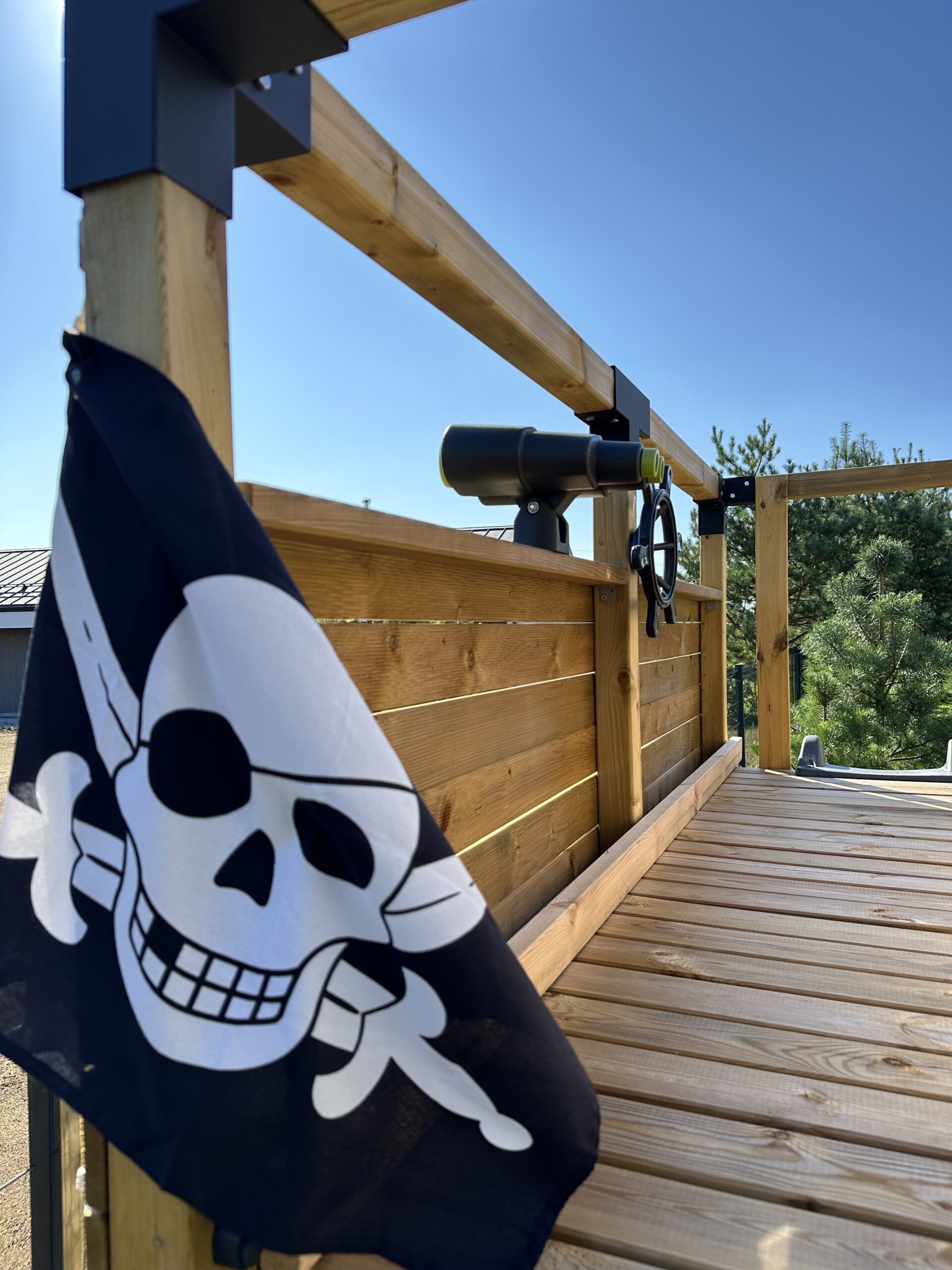 DĖMESIO! Žaidimų aikštelė pagaminta iš natūralios, neapdorotos žaliavinės medienos ir skirta naudojimui lauke. Šio tipo medienai būdingi nelygumai, kartais smulkūs išilginiai įtrūkimai, gali pasitaikyti šakų ar būti nedidelis šiūrkštumas, kuris nesudėtingai pašalinamas šlifavimo (švitriniu) popieriumi. Mediena, iš kurios gaminamos žaidimų aikštelės, yra atrinkta iš sertifikuotų tiekėjų, jai taikomas FSC sertifikavimas.