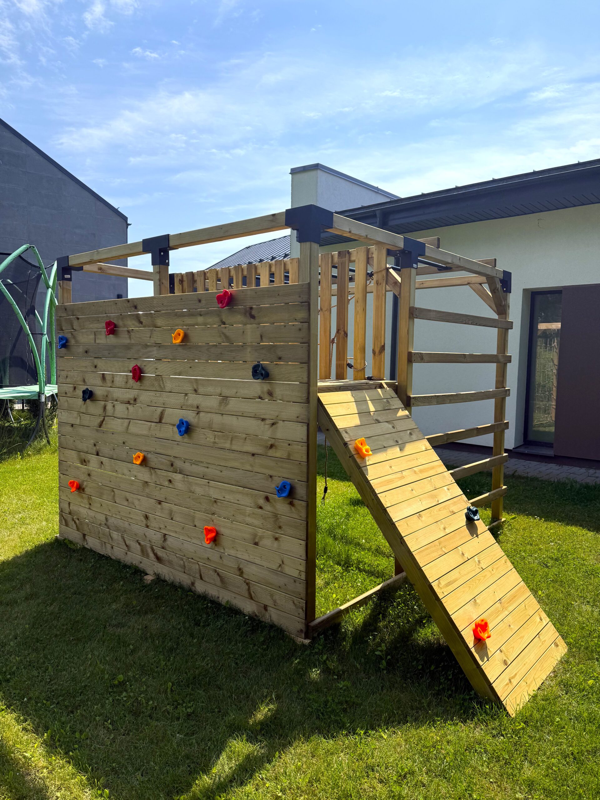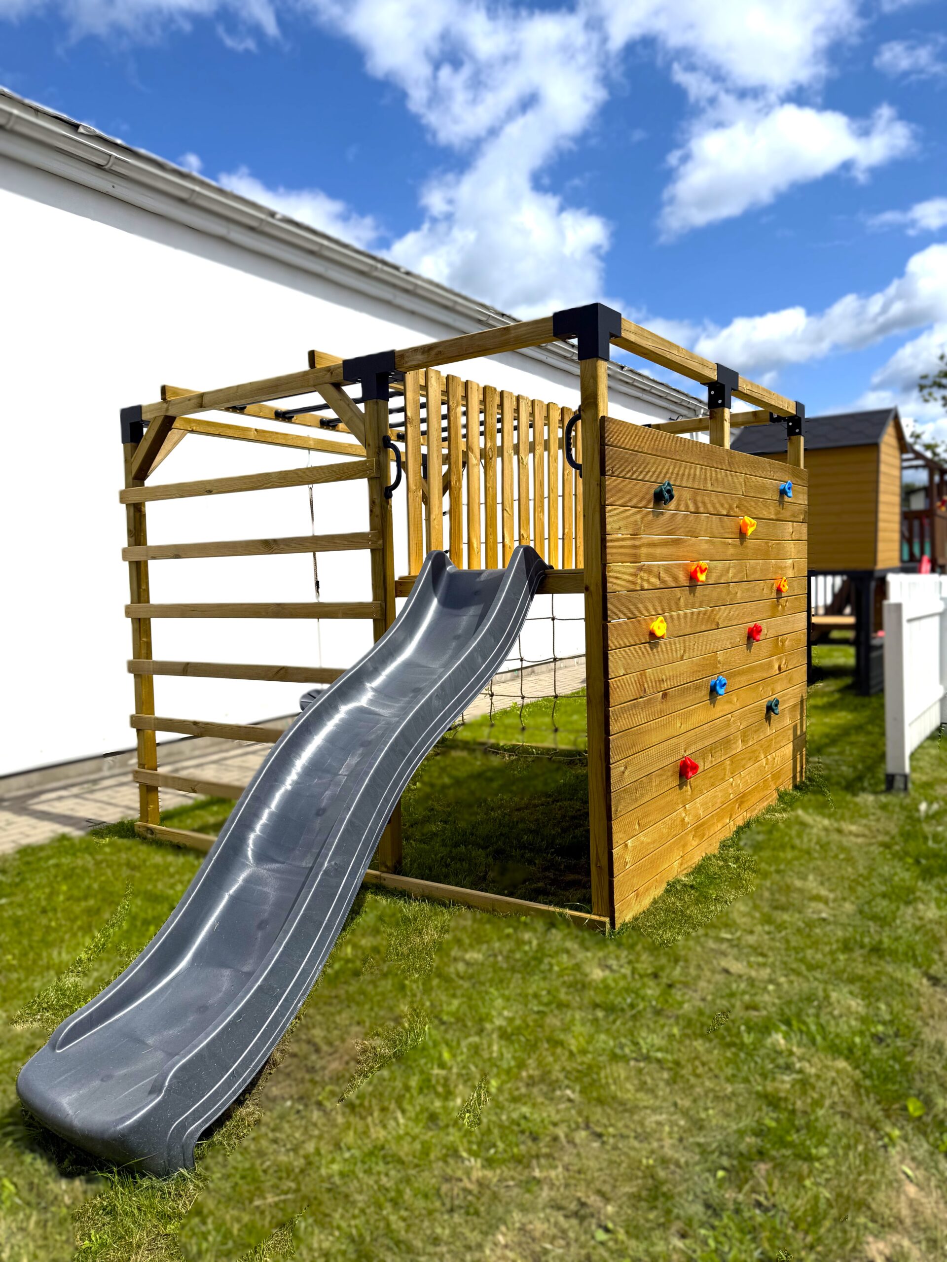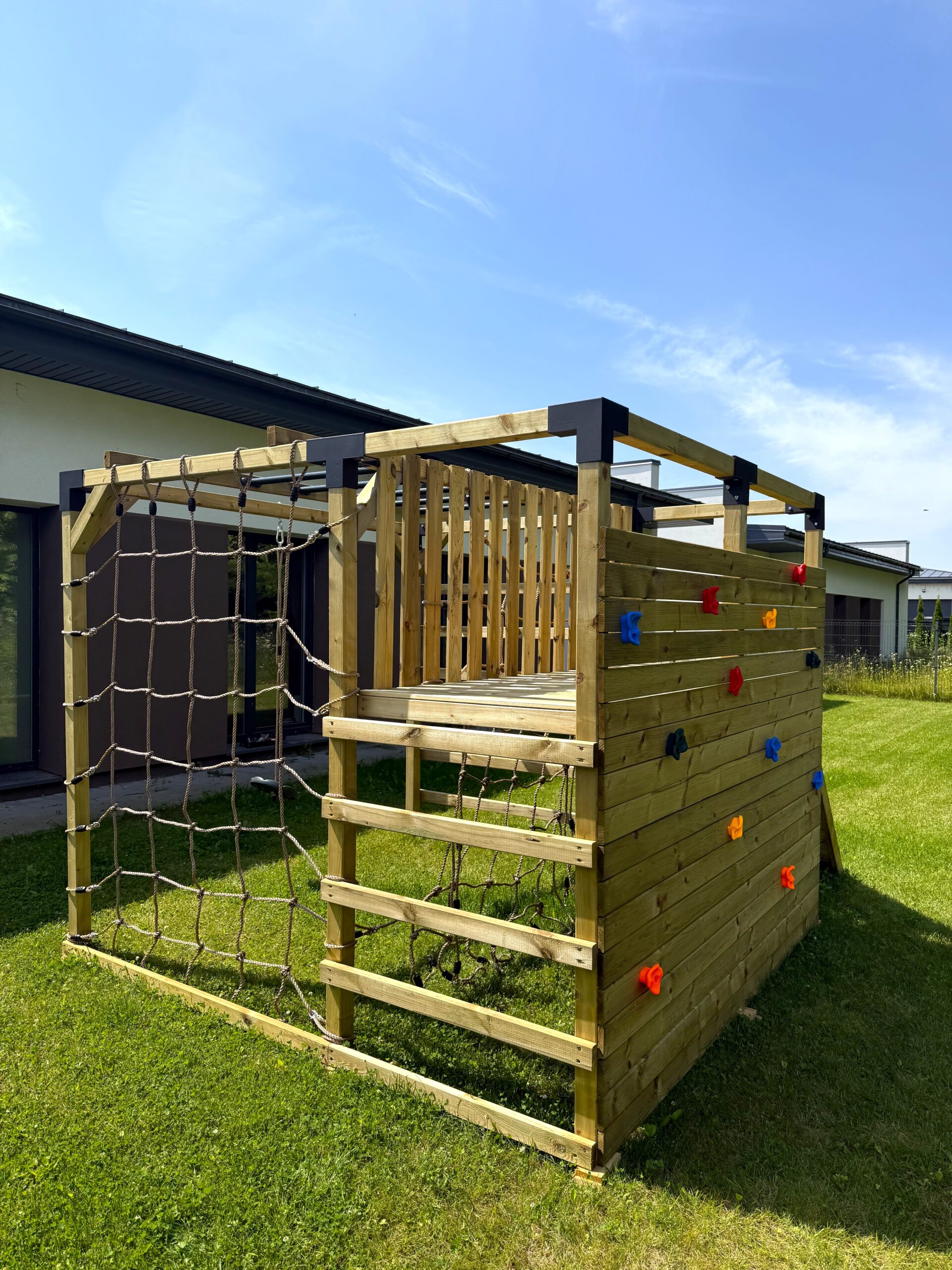 – Didelė laipiojimo siena, komplektuojama su 10 vnt. laipiojimo kybių. Esant poreikiui tvirtinti daugiau laipiojimo kybių, juos galima įsigyti papildomai.
