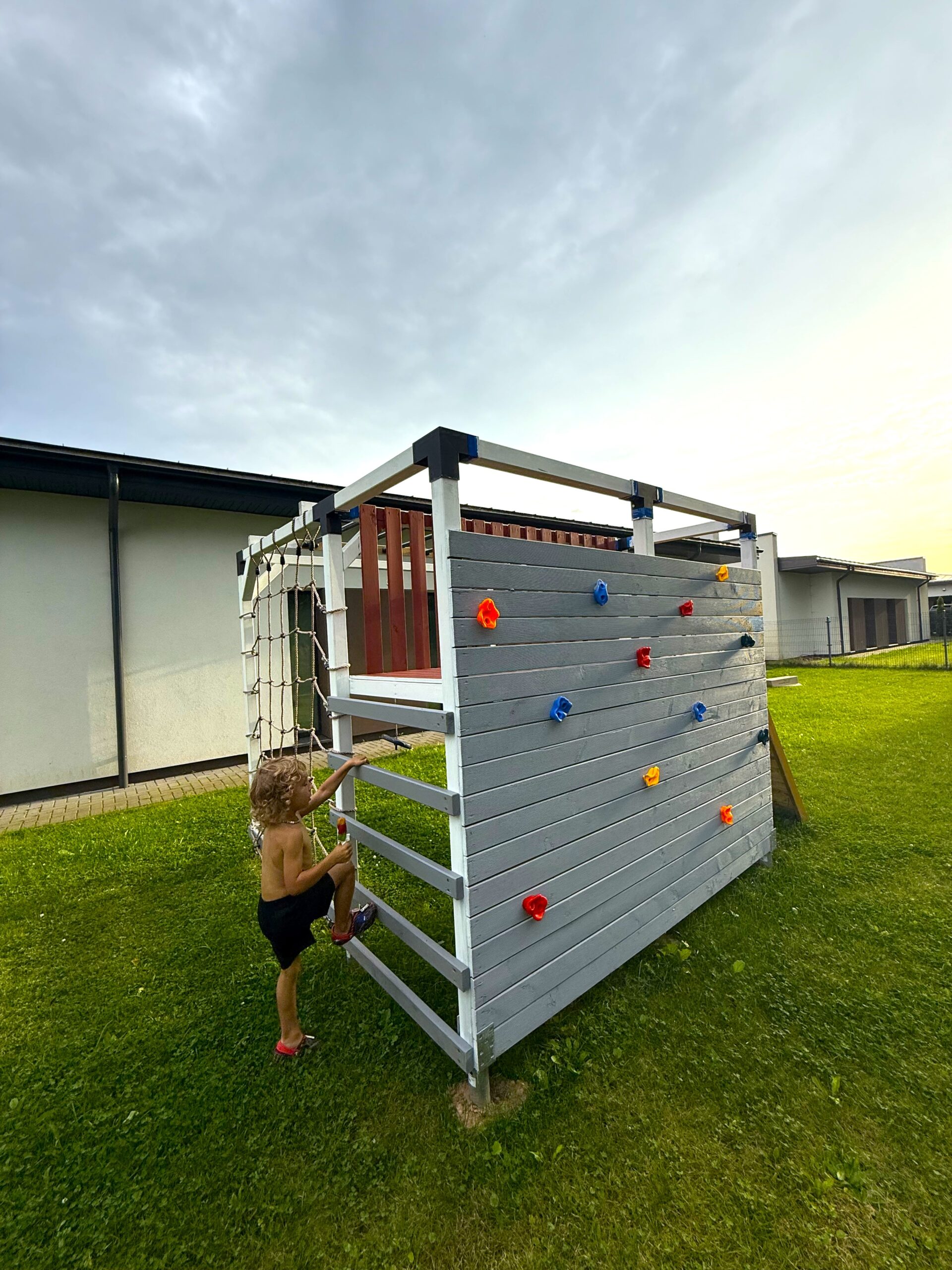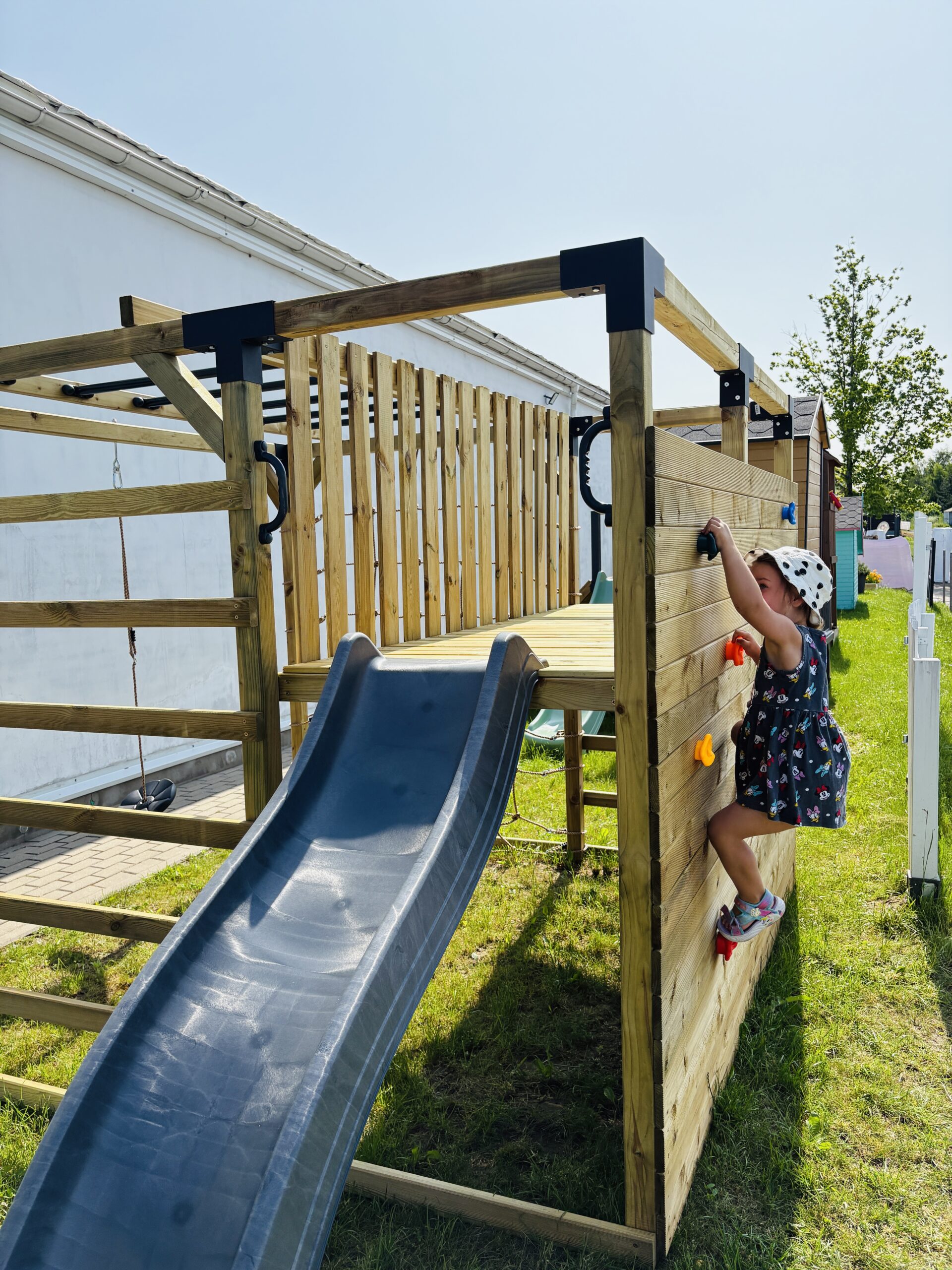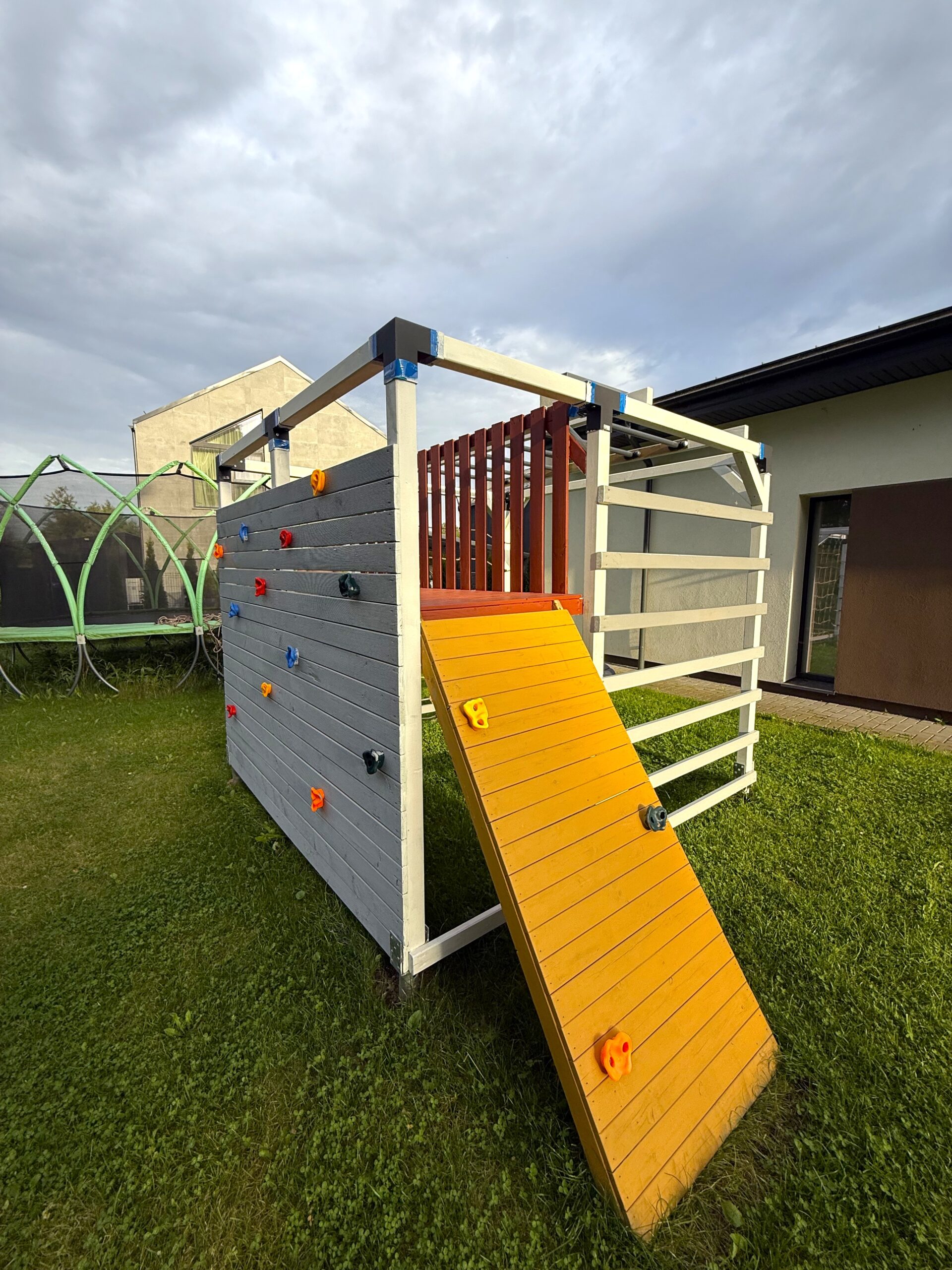 – Didelė laipiojimo siena, komplektuojama su 10 vnt. laipiojimo kybių. Esant poreikiui tvirtinti daugiau laipiojimo kybių, juos galima įsigyti papildomai.