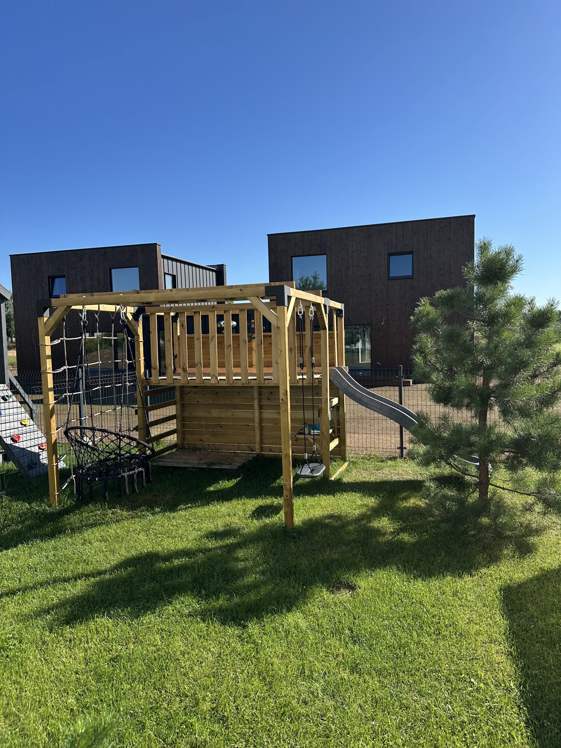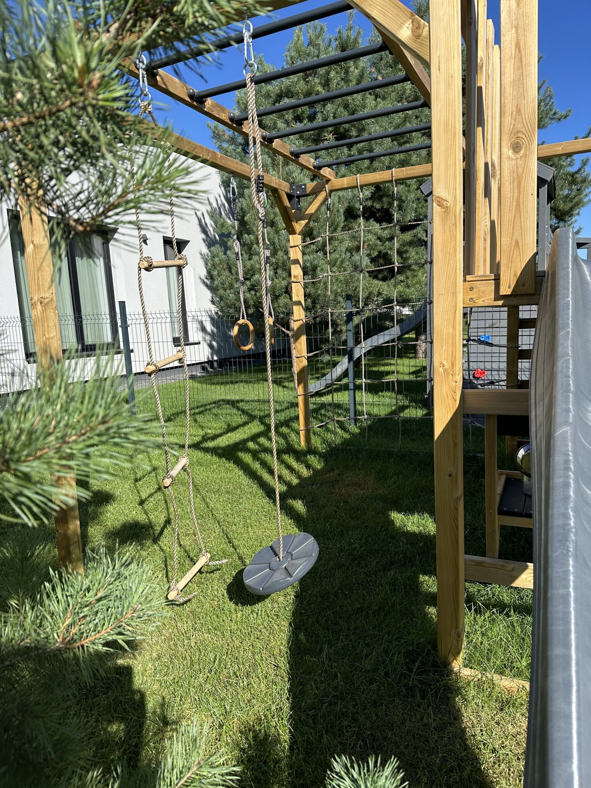 Surinkus žaidimų aikštelę, būtina leisti medienai gerai išdžiūti, tuomet mediena įgauna rusvą atspalvį, o impregnanto likučiai nutrupa arba yra nesudėtingai nuvalomi. Rekomenduojame medines dalis nudažyti – tai taps tikra kiemo puošmena, o dažų sluoksnis sukurs papildomą apsaugą medienai ir žaidimų aikštele galėsite mėgautis dar ilgiau. Jei planuojate dažyti žaidimų aikštelę – būtinai leiskite medienai pilnai išdžiūti, nerekomenduojame dažyti drėgnos medienos!