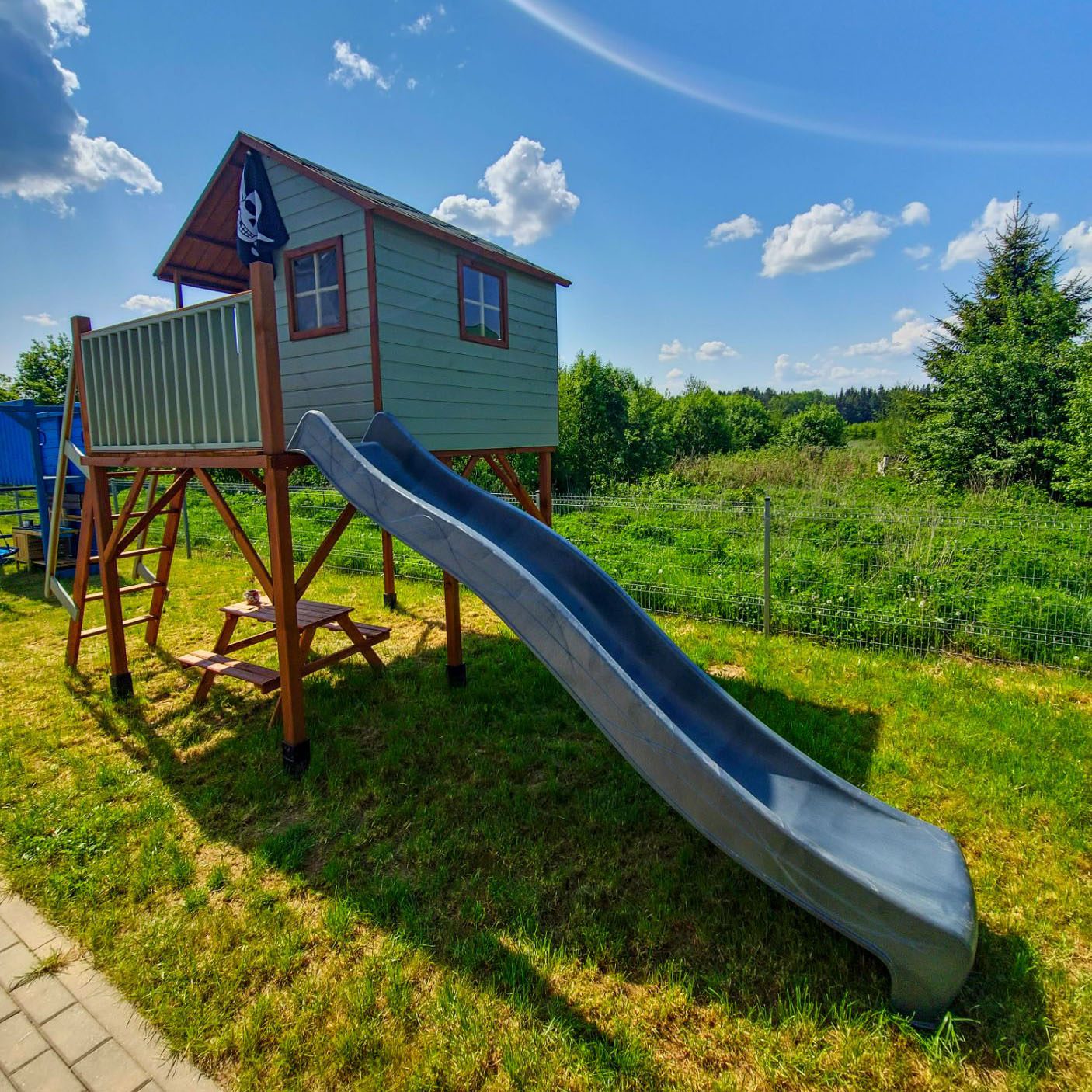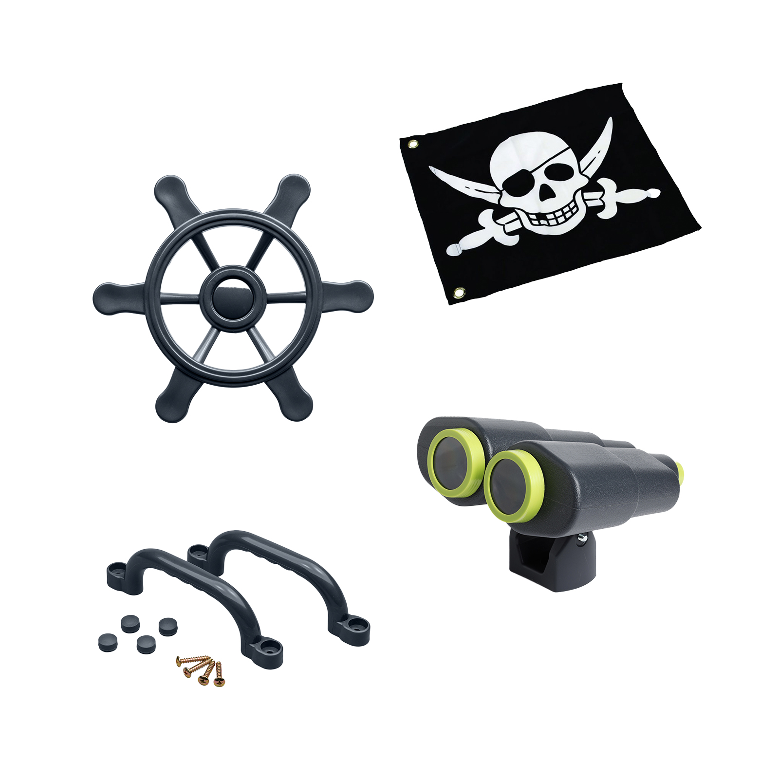 Komplektą sudaro vairas, vėliava, žiūronai ir rankenėlių komplektas, yra viskas, ko reikia, kad vaikai patirtų nepamirštamas akimirkas, aktyviai leistų laiką ir lavintų savo kūrybiškumą. Antracito spalva suteikia vientisumo ir išskirtinumo. Kokybiškos medžiagos užtikrina atsparumą oro sąlygoms.