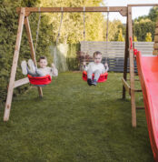 Medinis vaikų žaidimų namelis “Koriukas” su dvigubomis sūpynėmis